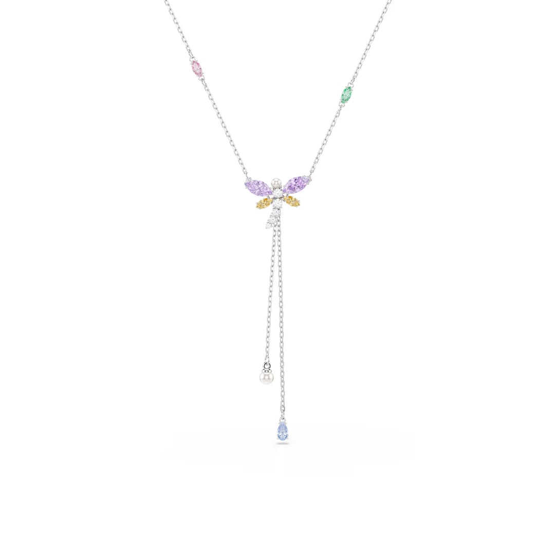 Embrace the transformative power of the dragonfly with this evocative Y-shape necklace. While the chain is accented with multicolored Swarovski Zirconia, the central dragonfly motif is made with a single Swarovski Crystal Pearl and pastel-colored wings in pink and purple. Two long strands hang beneath with an additional Swarovski Crystal Pearl and a blue Swarovski Zirconia. Wear it alongside the other dragonfly jewelry pieces for an infusion of joy.