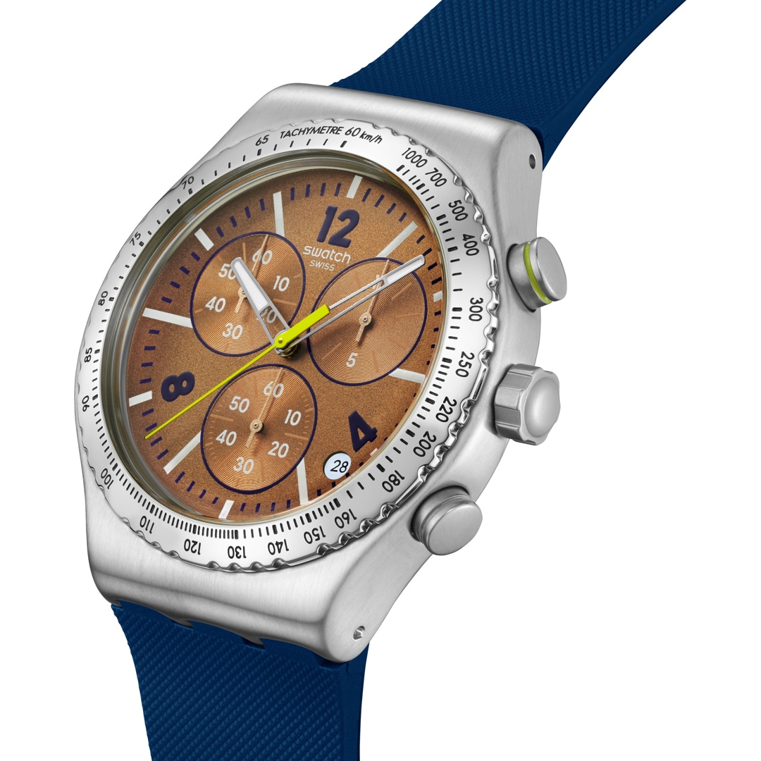 - Great watch, just typical Swatch, clean workmanship and new in environmentally friendly packaging. There is one downside: the black second hand on the chrono function is difficult to read, a different color would be helpful. I had to use the option to extend the steel bracelet. Christian sent me the appropriate links without any red tape and at no extra cost. That's what I call top customer service. (Posted on 06.03.2022)