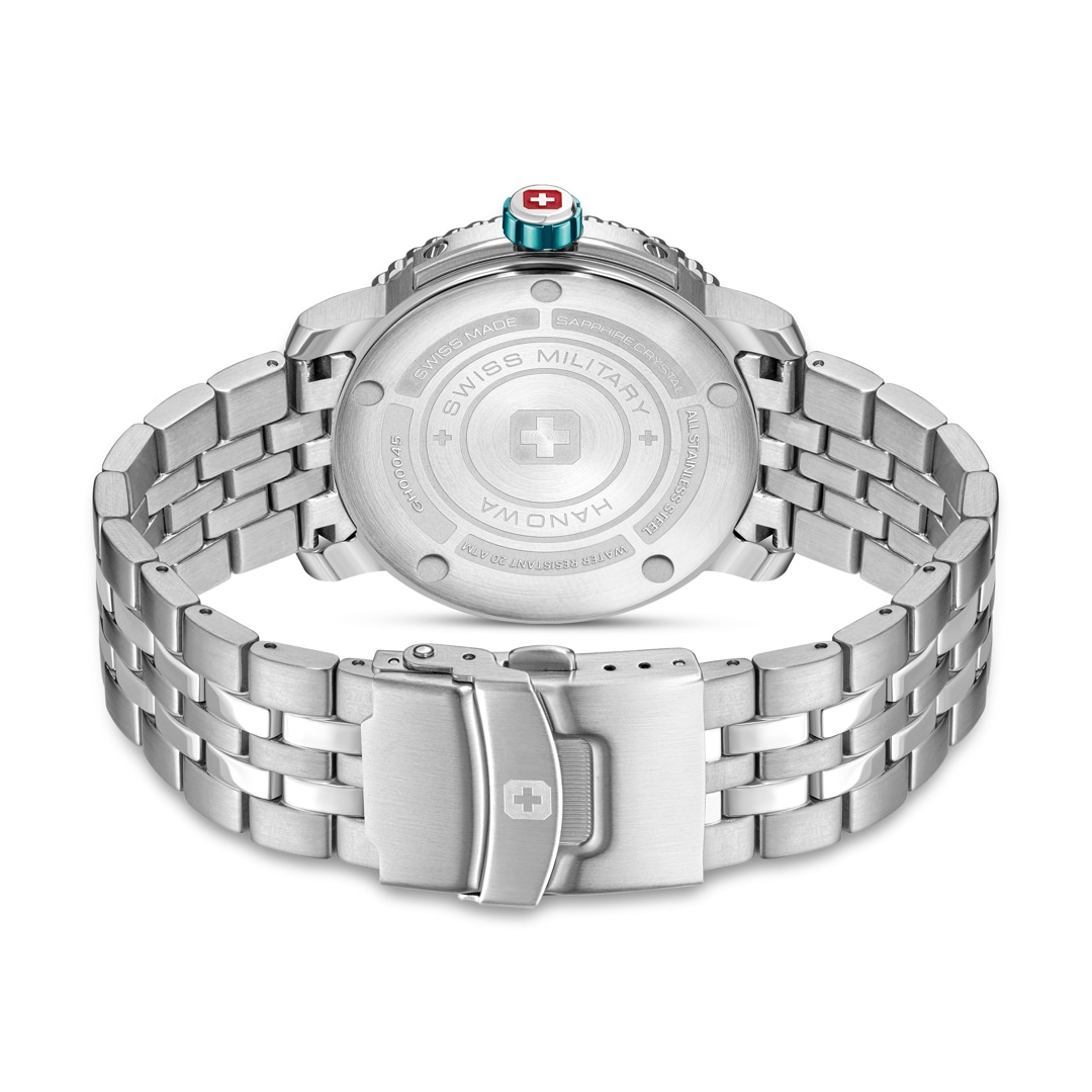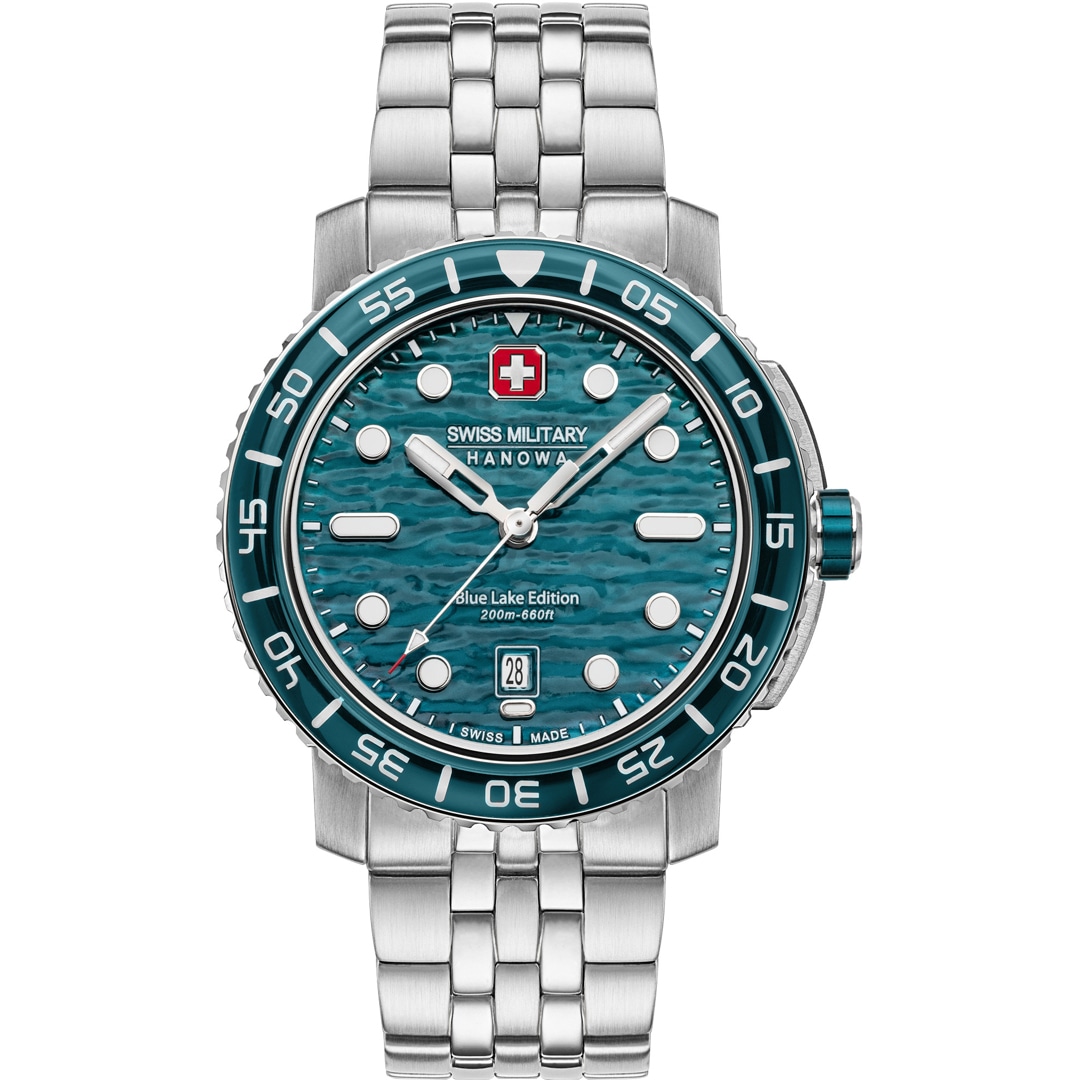 Built for divers and inspired by Switzerland's stunning Blue Lake, the Swiss Blue Lake timepiece combines style and functionality. The 44mm stainless steel case is pressure-resistant to 200 metres, while the unidirectional rotating bezel, screw-down crown and scratch-resistant sapphire crystal ensure safety during dives. The green and blue Hydraulic embossed dial with lacquer finish has luminescent hour markers for clear visibility underwater. This watch makes a bold statement both on land and at sea.
