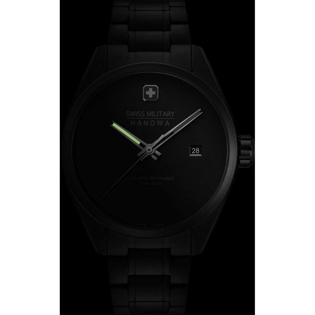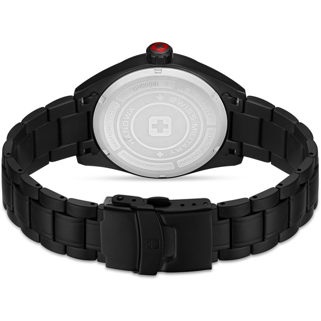 Swiss Military Hanowa Pioneer Stealth embraces pure minimalism with an all-black execution, featuring a sleek 41mm black-plated stainless steel case and bracelet. Its dial, free of hour markers, focuses on the essentials with just a date window for function. This quartz-driven timepiece offers 10 ATM water resistance and a sapphire crystal for durability. A true testament to modern design, the watch delivers an uninterrupted, minimalist aesthetic that blends perfectly with any style. Part of an exclusive capsule collection, this timepiece embodies modern design with a tactical edge, engineered for those who move with quiet confidence.