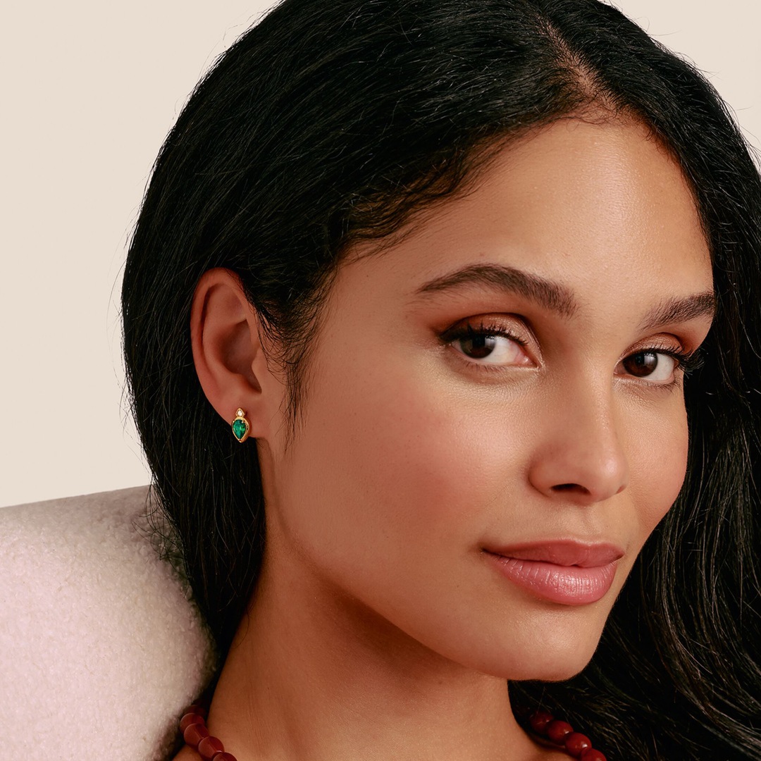 Understated yet expressive: an intense emerald-green teardrop stone creates a clear, feminine accent, subtly accompanied by a warm gold glow. The slender teardrop shape gives the design a light dynamism – ideal for confident looks that effortlessly blend elegance and lightness.