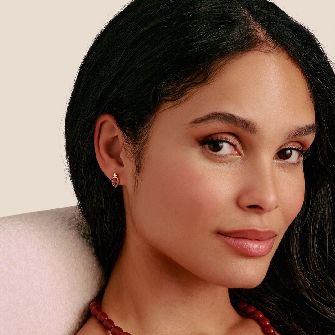 Simple yet expressive: a garnet-red zirconia in elegant teardrop cut captures attention, while a small white stone above adds subtle sparkle. The plating lends a warm glow; the minimalist design emphasizes poise and lightness. Part of the Elyndra collection – for days when you combine understated elegance with confident style.