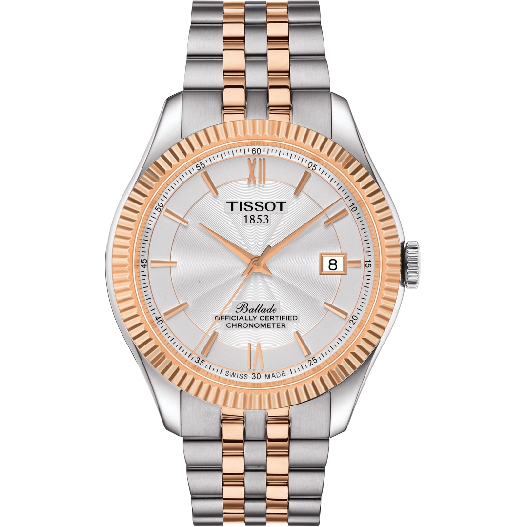 Regarding design, the Tissot Ballade exudes timeless elegance, with refined details and polished finishes that impart a silky sheen. Its chic silhouette ensures effortless transition from day to night, while thoughtful elements like the ribbed decor on the bezel and clear, legible dial enhance wearability. This men's model of the Tissot Ballade, certified as a chronometer, features a silver opaline dial with Roman numerals and indices, protected by scratch-resistant sapphire crystal. The bicolor 316L stainless steel case with rose gold PVD coating includes a transparent case back, and the solid bicolor 316L stainless steel bracelet with rose gold PVD coating features a butterfly clasp with push buttons.