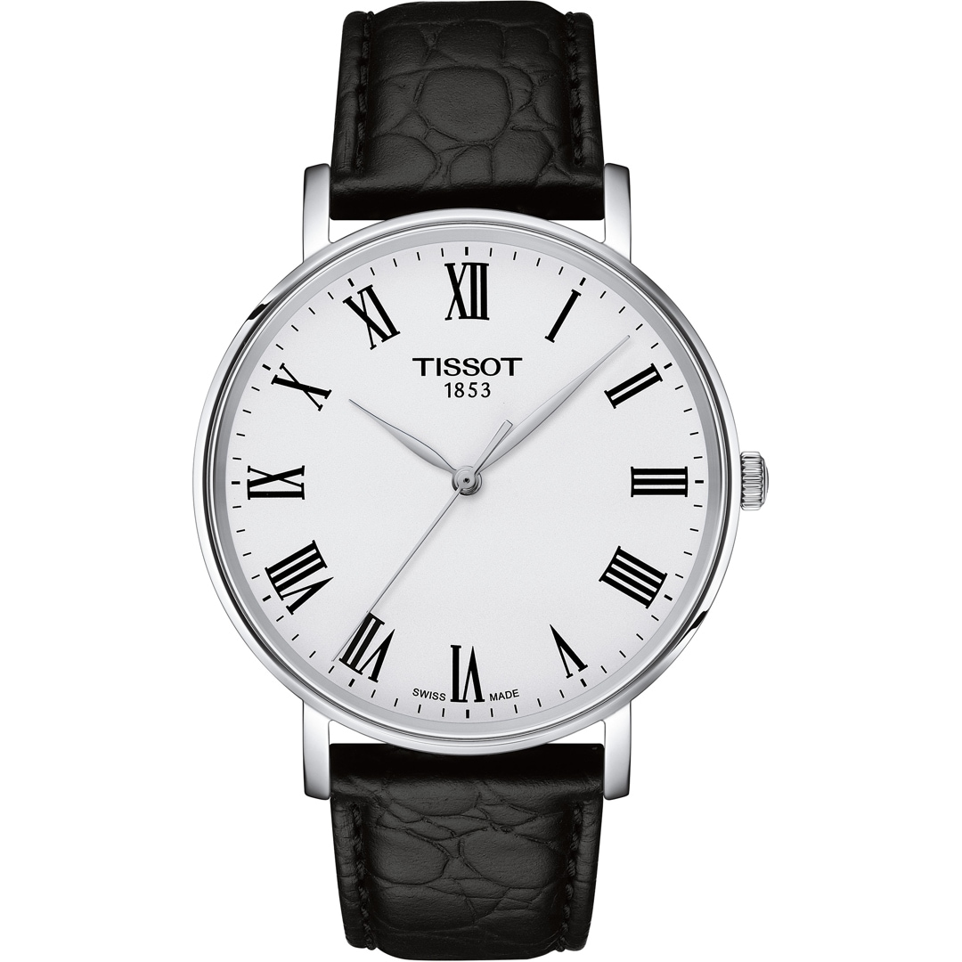 Various straps complement the watch perfectly, giving each Tissot Everytime its own unique look. This model from the Tissot Everytime Gent collection features a silver dial with black Roman numerals, paired with a black leather strap with a buckle closure.