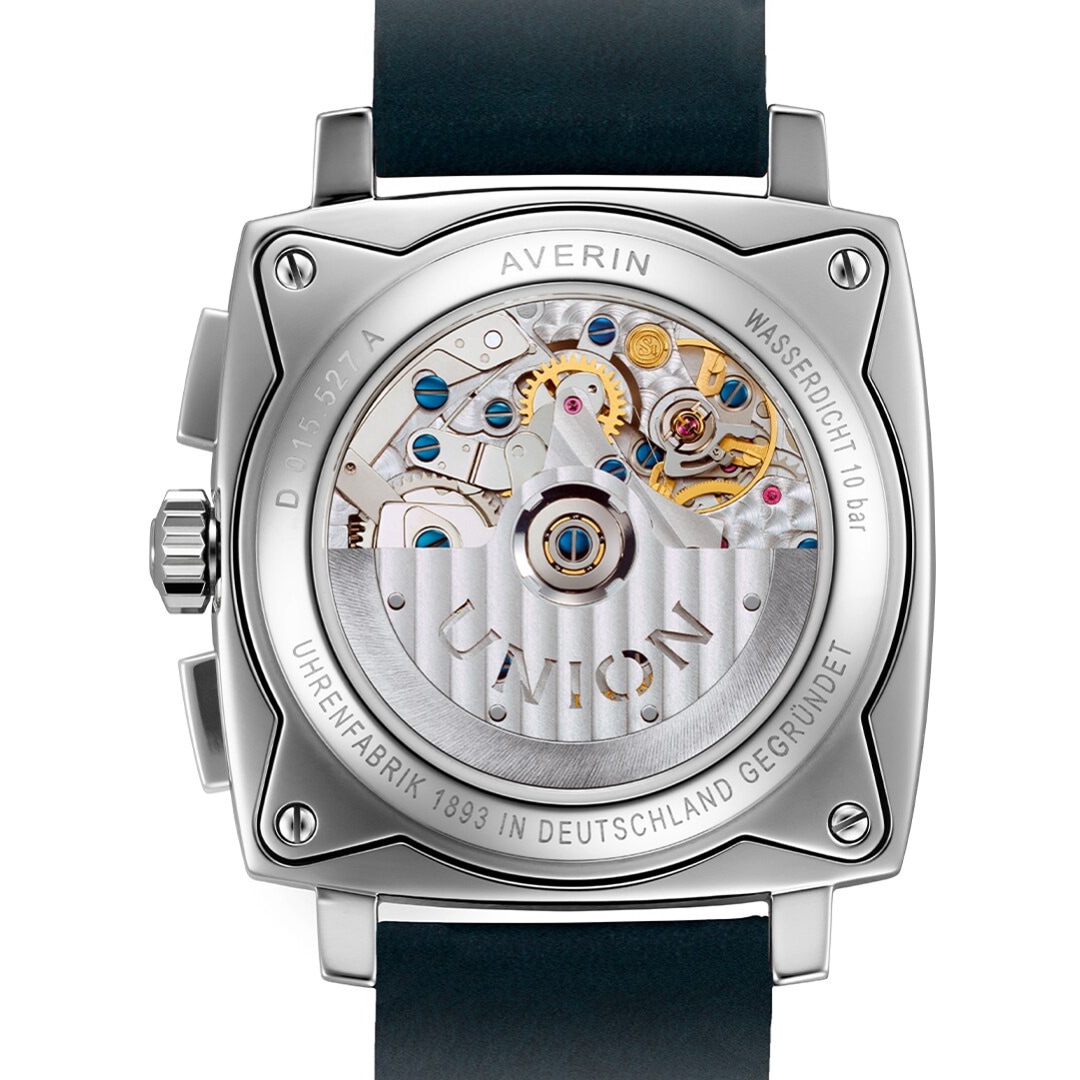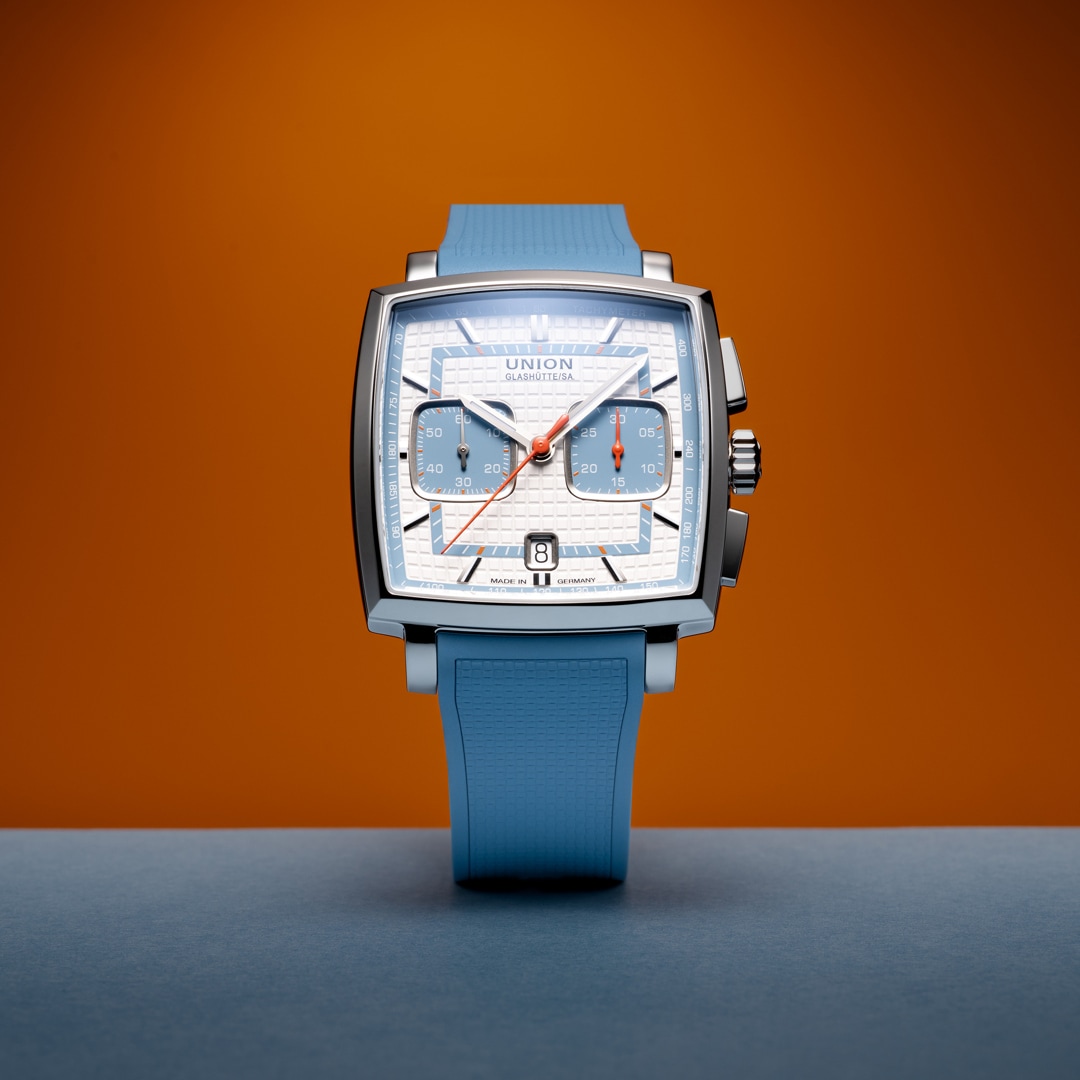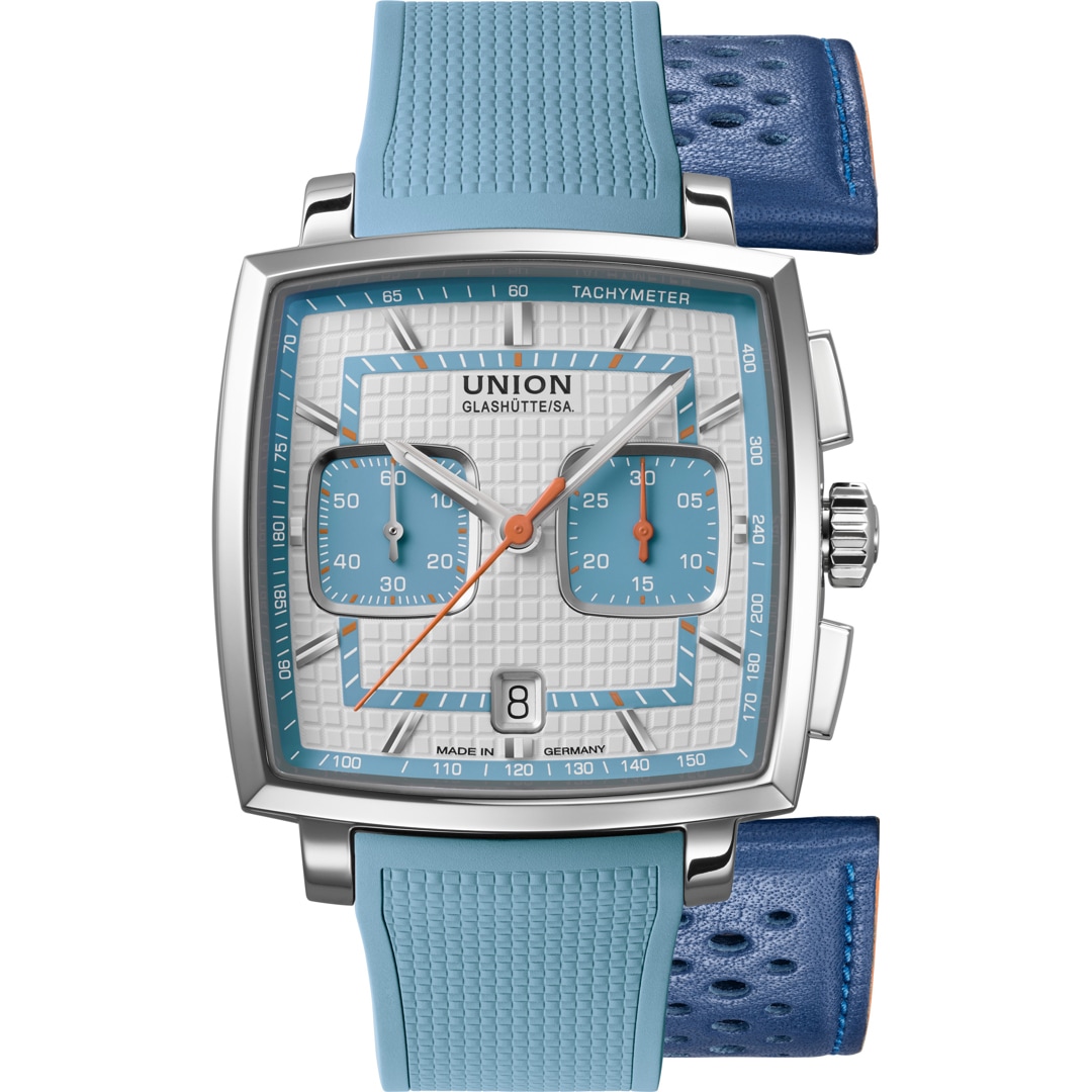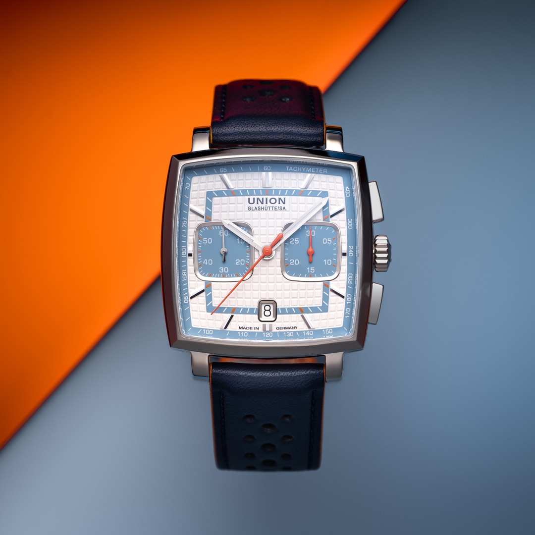 The Averin Chronograph combines iconic design with the highest level of German watchmaking. The characteristic square 41 x 41 mm case meets a white dial with sky-blue accents, inspired by the clarity of classic dashboards. The embossed tile pattern adds a special depth effect and creates a modern, sporty-elegant look. Thanks to the instrument-like layout – small seconds at 9 o'clock, 30-minute counter at 3 o'clock, and date at 6 o'clock – the time is clearly legible at a glance. The slightly domed sapphire crystal, anti-reflective on both sides, is reminiscent of the lines of iconic car bodies. The lacquered hands and Super-LumiNova® coating guarantee excellent legibility day and night. Inside, the modern caliber UNG-27.S2 with a silicon balance spring and a power reserve of at least 65 hours ensures the highest precision, made in Glashütte. The color-coordinated dials offer versatile styling options. Matching straps – a leather strap with racing perforations or a sporty rubber strap, which can be changed in a flash thanks to the quick-release system. Perfect for anyone looking for an exceptional design and wanting to combine sporty character with stylish elegance.