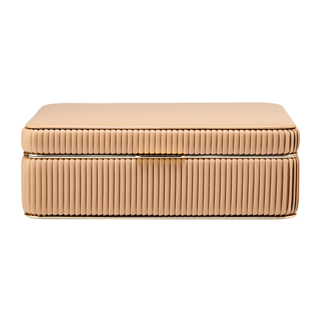 The Bella Medium Jewellery Box combines opulence and sophistication. Its smooth vegan leather lid, perfectly pleated sides, and gold-finished interior frame and hardware give the box an elegant look.