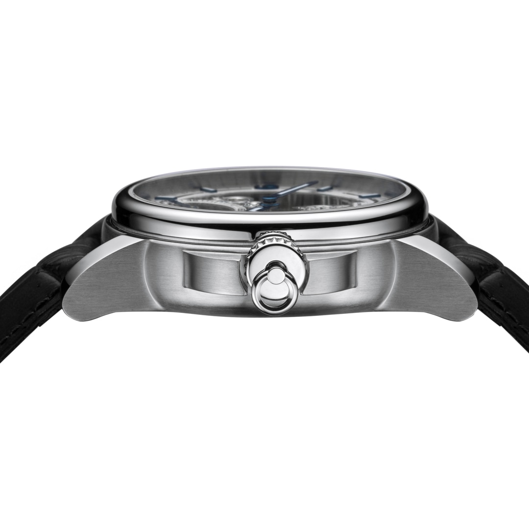 Das skelettierte Zifferblatt zeigt einen kunstvoll gestalteten Zifferblattring mit applizierten Ziffern und Indexen sowie einer kleinen Sekunde bei 6 Uhr. Im Inneren tickt das skelettierte Unitas 6498 Uhrwerk, das nicht nur mit einer aufwändigen Gravur, sondern auch mit gebläuten Schrauben veredelt ist, und damit höchsten Ansprüchen an Handwerkskunst und Ästhetik gerecht wird.
