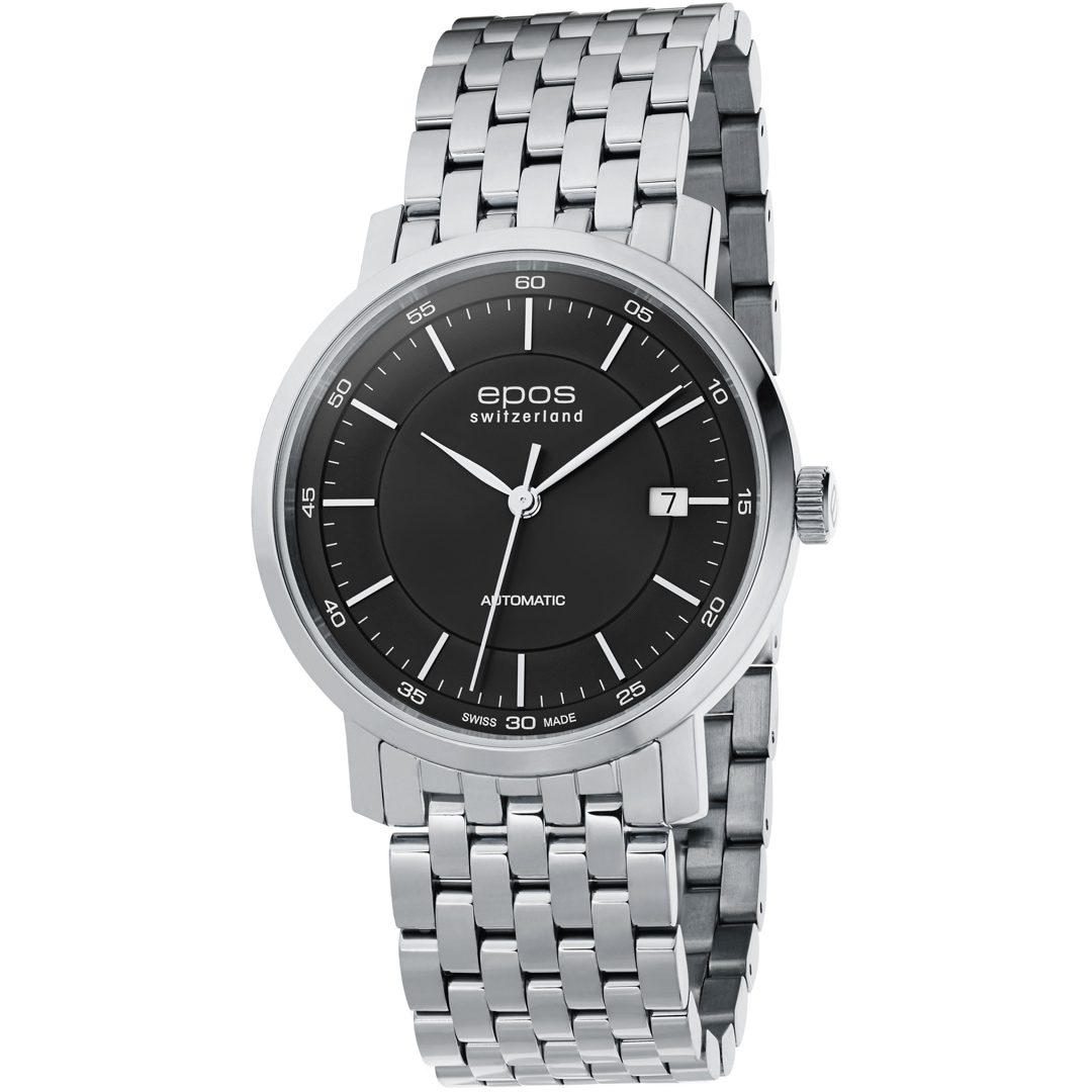 Die Epos Timeless 3387 Automatic verbindet klassische Eleganz mit hochwertiger Schweizer Uhrmacherkunst. Ihr voll poliertes Edelstahlgehäuse mit kratzfestem Saphirglas und Glasboden setzt das fein dekorierte Sellita SW300 Uhrwerk perfekt in Szene. Werk und Rotor sind mit aufwendig gearbeitetem Perlschliff verziert, der durch den Sichtboden bewundert werden kann. Dieses elegante Modell besticht durch zeitlose Ästhetik, präzise Mechanik und höchste Verarbeitungsqualität – ein stilvoller Begleiter für Liebhaber klassischer Automatikuhren, die Wert auf Raffinesse und Swiss Made Präzision legen.