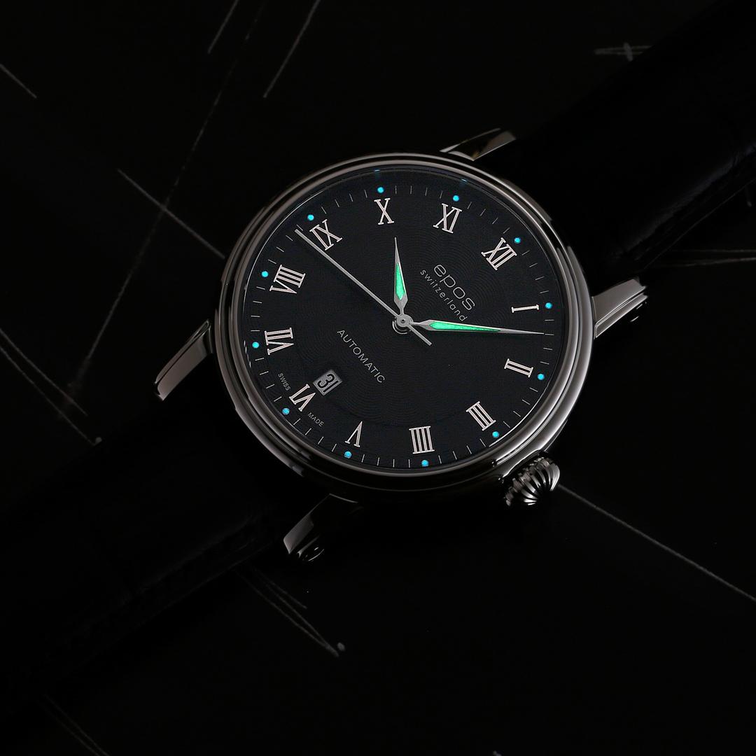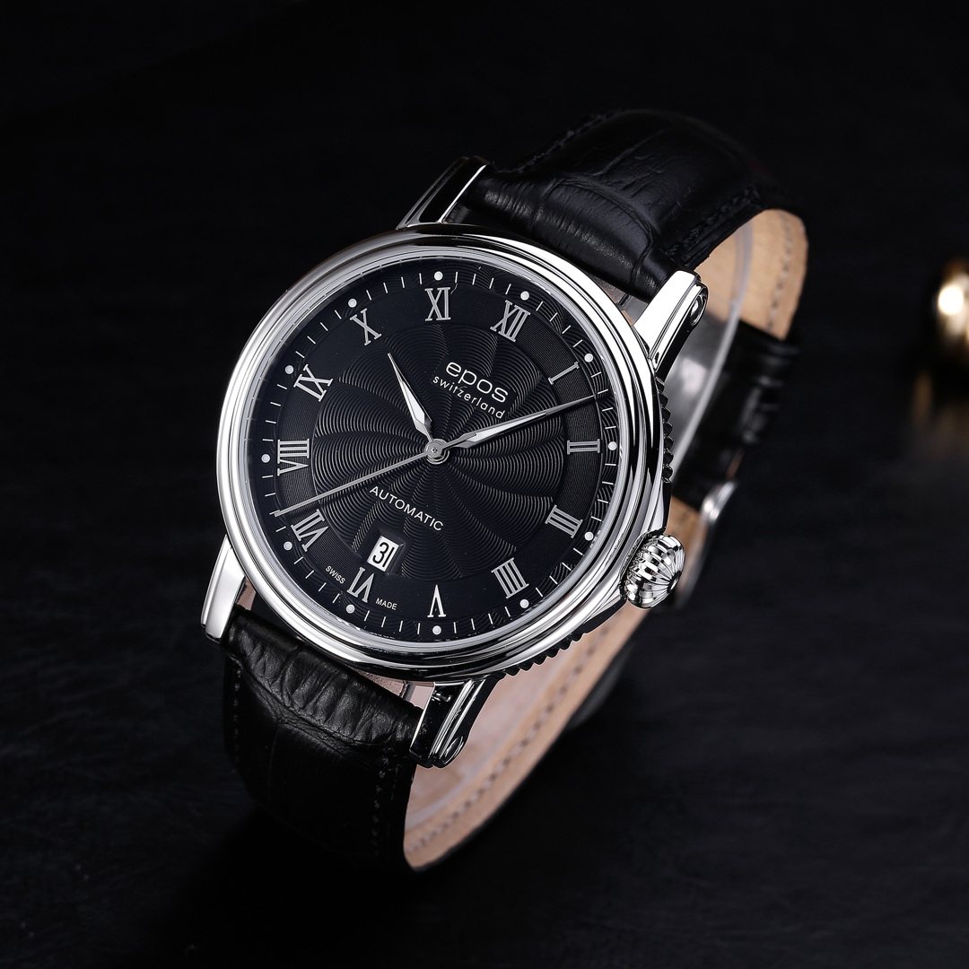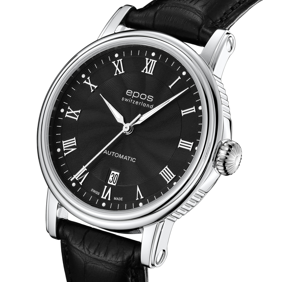 Die Epos Timeless 3390 Automatic vereint klassische Eleganz mit meisterhafter Uhrmacherkunst. Das polierte Emotion-Gehäuse mit den charakteristischen Rillen an den Seiten und verschraubtem Armband verleiht der Uhr eine markante Präsenz. Durch den Glasboden lässt sich das voll dekorierte Sellita SW300 Uhrwerk mit hochwertigem Perlschliff auf Werk und Rotor bewundern. Das klassische Emotion-Zifferblatt besticht durch applizierte römische Zahlen, Leuchtindexe und feine Guillochierung. Diese Uhr verbindet zeitloses Design, präzise Schweizer Mechanik und stilvolle Raffinesse – ein eleganter Begleiter für jeden Anlass.