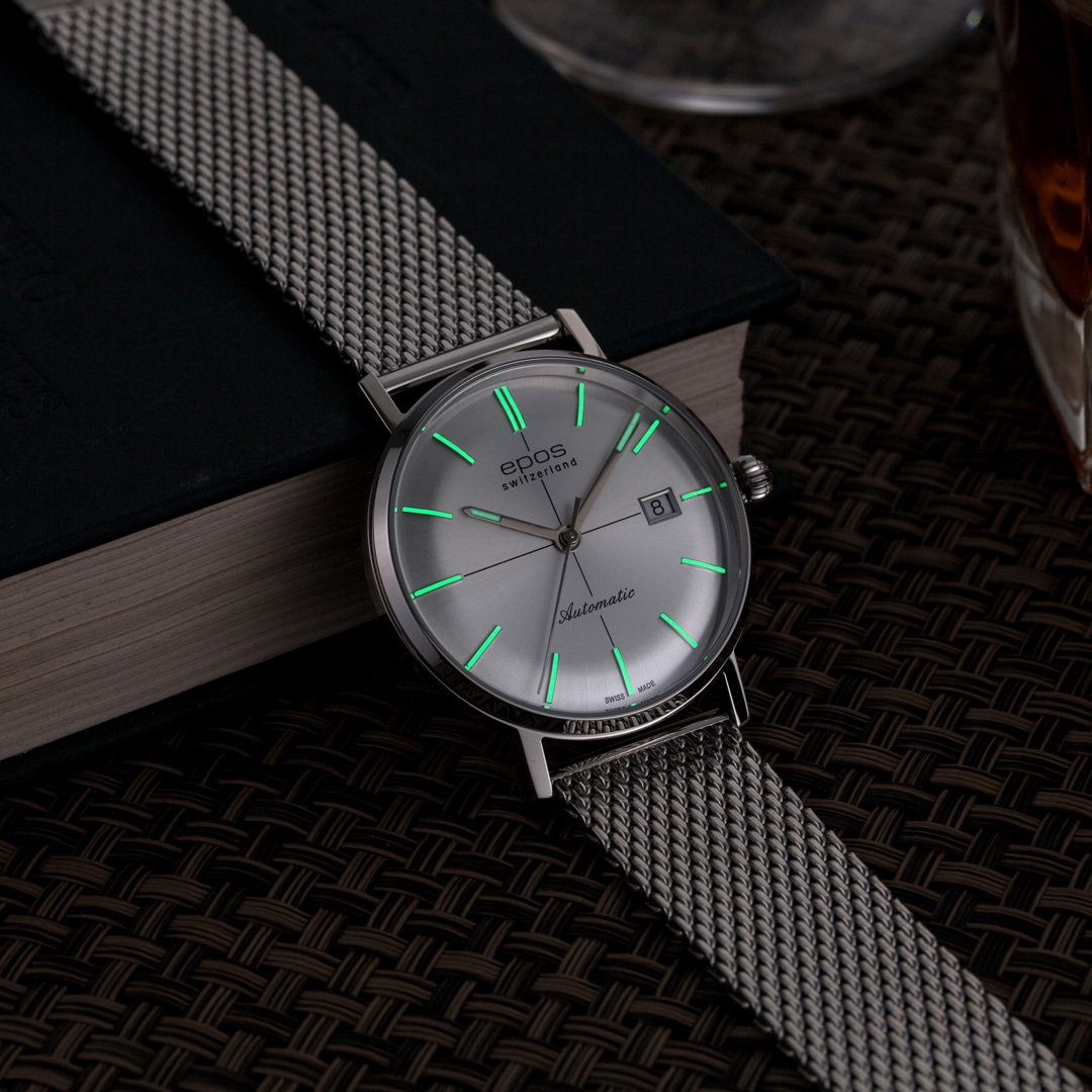 Die Epos Timeless 3437 Automatic Date vereint Retro-Charme und moderne Technik in einer Premium-Automatik. Ihr Edelstahlgehäuse, ausgestattet mit stark bombiertem, kratzfestem und entspiegeltem Saphirglas, erinnert an den klassischen Plexiglaslook der 50er Jahre. Das voll dekorierte ETA 2824-2 Uhrwerk mit Côtes de Genève Schliff ist durch den Glasboden sichtbar. Das bombierte Retro-Zifferblatt mit Sonnenstrahlenschliff und applizierten Indexen, die mit Leuchtmasse handgefüllt sind, sorgt für aussergewöhnliche Lesbarkeit, selbst im Dunkeln. Ein stilvolles Meisterwerk der Uhrmacherkunst.