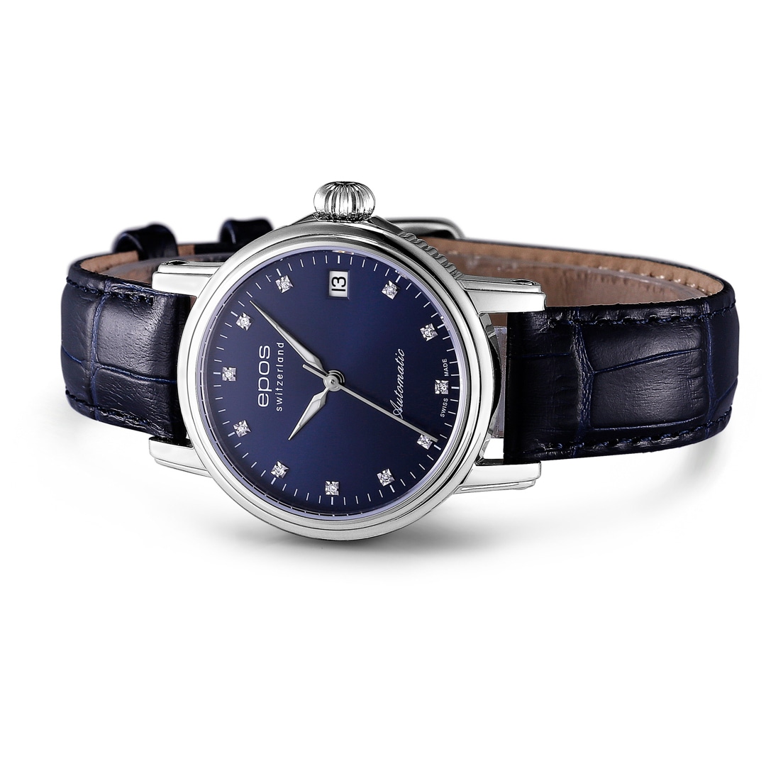 Entdecken Sie die zeitlose Eleganz der Epos Timeless 4390 Diamonds. Diese klassische Damenuhr aus der Timeless-Kollektion beeindruckt mit echten Diamanten auf dem Zifferblatt und einem aufwändigen Emotion-Gehäusedesign. Das vollständig dekorierte Premium Sellita SW300 Uhrwerk ist durch den Glasboden sichtbar und verleiht der Uhr eine zusätzliche Raffinesse.