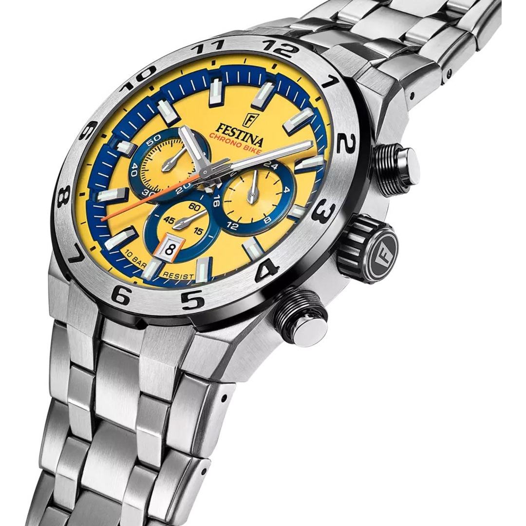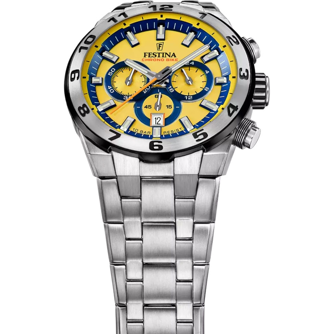 Die Festina Chrono Bike Herrenuhr ist eine grossartige Ergänzung zur exklusiven Chrono Bike Kollektion. Sie symbolisiert die Harmonie zwischen Raffinesse und Praktikabilität. Diese Uhr wurde sorgfältig für den modernen Mann entworfen, der Eleganz in ihrer funktionalsten Form schätzt. Das Gehäuse, aus 316L-Edelstahl gefertigt, zeichnet sich durch seine Robustheit und aussergewöhnliche Korrosionsbeständigkeit aus, was gewährleistet, dass die Uhr ihren Glanz und ihre Widerstandsfähigkeit im Laufe der Zeit behält. Dieser Stahl, bekannt für seine Langlebigkeit, ist ideal für ein Accessoire, das den Anforderungen des täglichen Gebrauchs standhält.