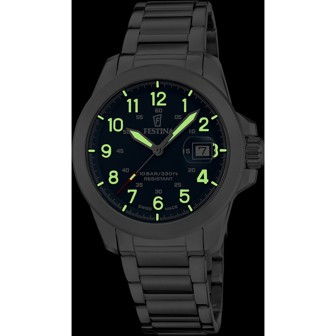 Inspiriert von den Felduhren des 20. Jahrhunderts, ist die Festina Swiss Made Field eine moderne Hommage an den Abenteuergeist. Der in der Schweiz aus hochwertigen Materialien gefertigte Zeitmesser vereint Robustheit, Funktionalität und Vielseitigkeit. Sein 42 mm grosses Gehäuse aus Edelstahl beherbergt ein präzises Schweizer Quarzwerk, das durch ein entspiegeltes Saphirglas geschützt ist, das in jeder Situation für maximale Klarheit sorgt.