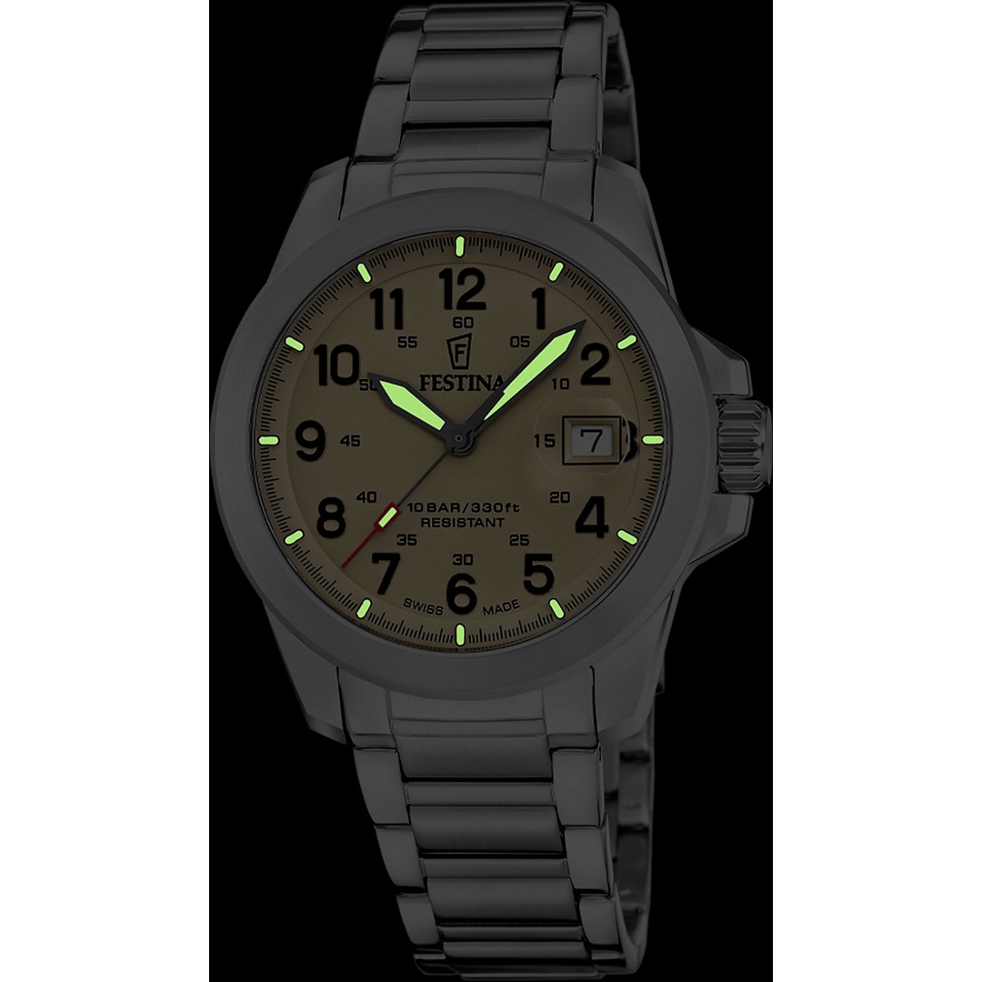 Inspiriert von den Felduhren des 20. Jahrhunderts, ist die Festina Swiss Made Field eine moderne Hommage an den Abenteuergeist. Der in der Schweiz aus hochwertigen Materialien gefertigte Zeitmesser vereint Robustheit, Funktionalität und Vielseitigkeit. Sein 42 mm grosses Gehäuse aus Edelstahl beherbergt ein präzises Schweizer Quarzwerk, das durch ein entspiegeltes Saphirglas geschützt ist, das in jeder Situation für maximale Klarheit sorgt.