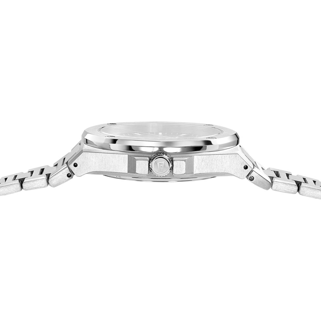 Ein kraftvoller Auftritt, der architektonisches Design und "Swiss Made"-Präzision vereint. Das 42-mm-Edelstahlgehäuse besticht durch seine markante, geometrische Lünette, die der Uhr einen unverwechselbaren Charakter verleiht. Das Zifferblatt zeugt mit seiner raffinierten Struktur und den applizierten Indizes von hoher Detailverliebtheit und bietet eine Datumsanzeige für beste Alltagstauglichkeit. Im Inneren schlägt das Herz der Uhr: das renommierte Schweizer Automatik-Kaliber Soprod P024, das für seine Zuverlässigkeit und eine Gangreserve von 38 Stunden bekannt ist. Ein ultra-kratzfestes Saphirglas schützt diesen hochwertigen Zeitmesser.