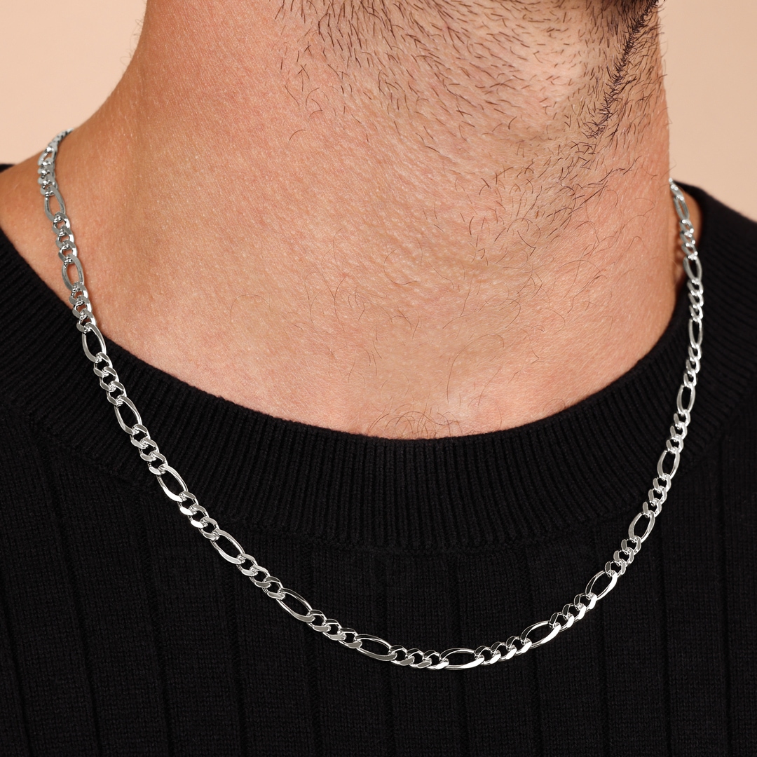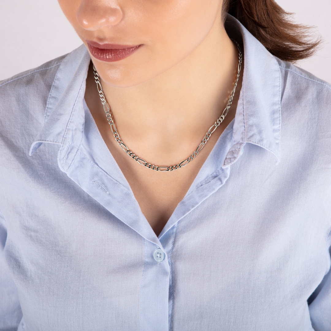 Die Figarokette ist eine Art von Kette, die im Wesentlichen einer Panzerkette ähnelt, da beide Ketten die gleiche Struktur haben. Das Besondere an der Figarokette, und was sie von herkömmllichen Panzerketten abgrenzt, ist zum einen das Vorhandensein von unterschiedlich gestalteten Kettengliedern und deren Anordnung. Bei dieser Figarokette folgen auf drei runde Panzerglieder immer ein längliches ovales, worauf sich wieder drei runde einreihen. Die ovalen und langen Glieder verleihen der Figarokette eine besonders filigrane und edle Optik. Die feine Kette liegt diskret an und ist vielseitig kombinierbar. Sie kann sowohl zum modernen Tagesoutfit als auch zur eleganten Abendgarderobe getragen werden.