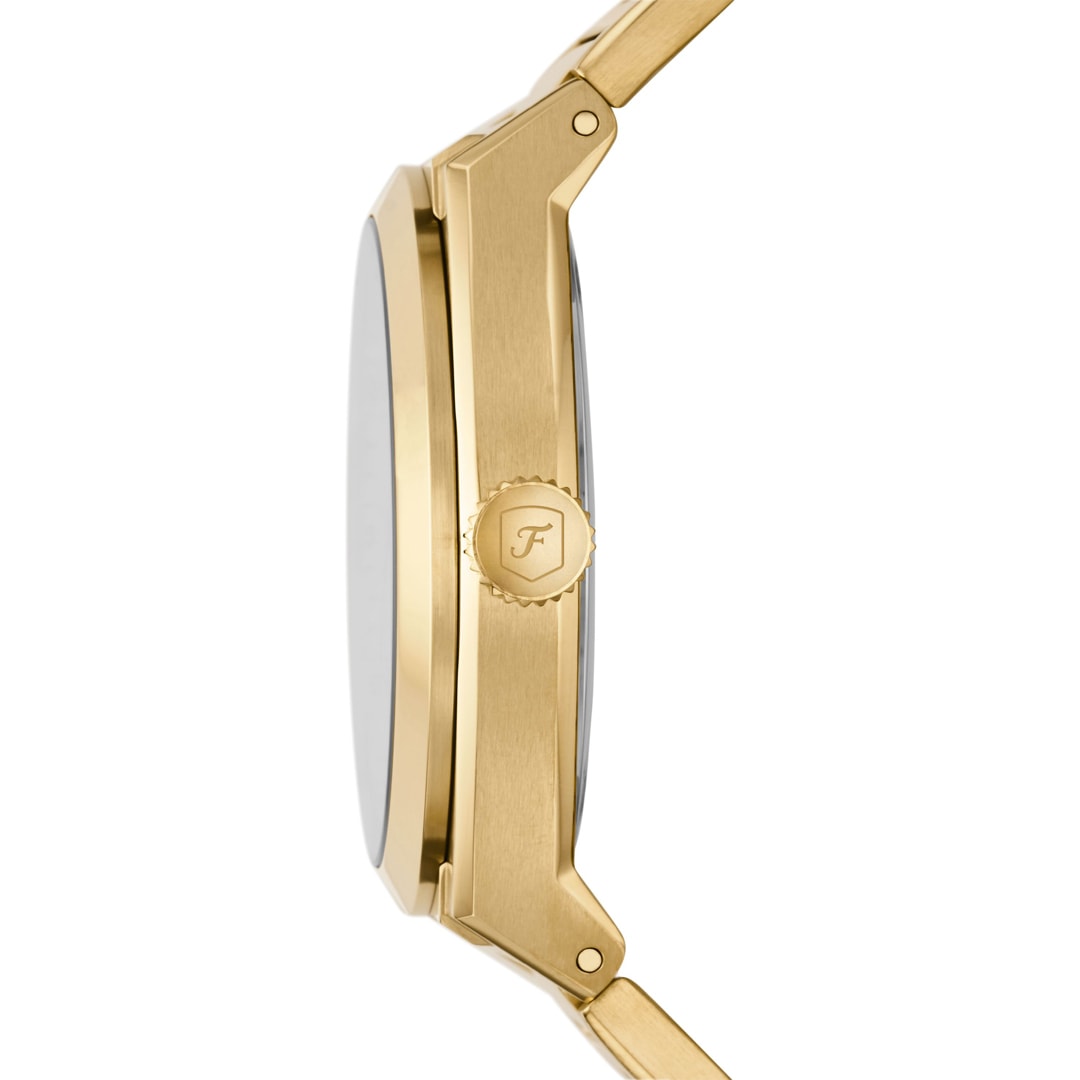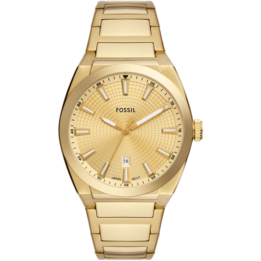 Diese Uhr Everett mit 42-mm-Gehäuse hat ein 3-Zeiger-Werk mit Datumsanzeige, ein goldfarbenes Sunray-Zifferblatt und ein goldfarbenes Edelstahlband.