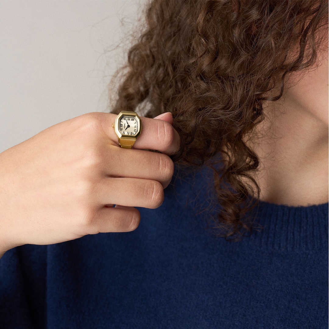 Diese Uhr ist eine einzigartige Mischung aus Schmuck- und Uhrendesign. Das achteckige, goldfarbene Edelstahlgehäuse und -band sorgen für einen eleganten, einheitlichen Look. Das matte, strukturierte cremefarbene Zifferblatt sorgt für dezente Tiefe und Kontrast, die 2-Zeiger-Funktionalität für minimalistischen Reiz. Die kompakte Grösse wird durch einen verstellbaren Verschluss ausgeglichen, der für eine individuelle, bequeme Passform sorgt.