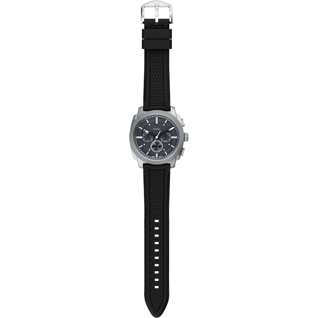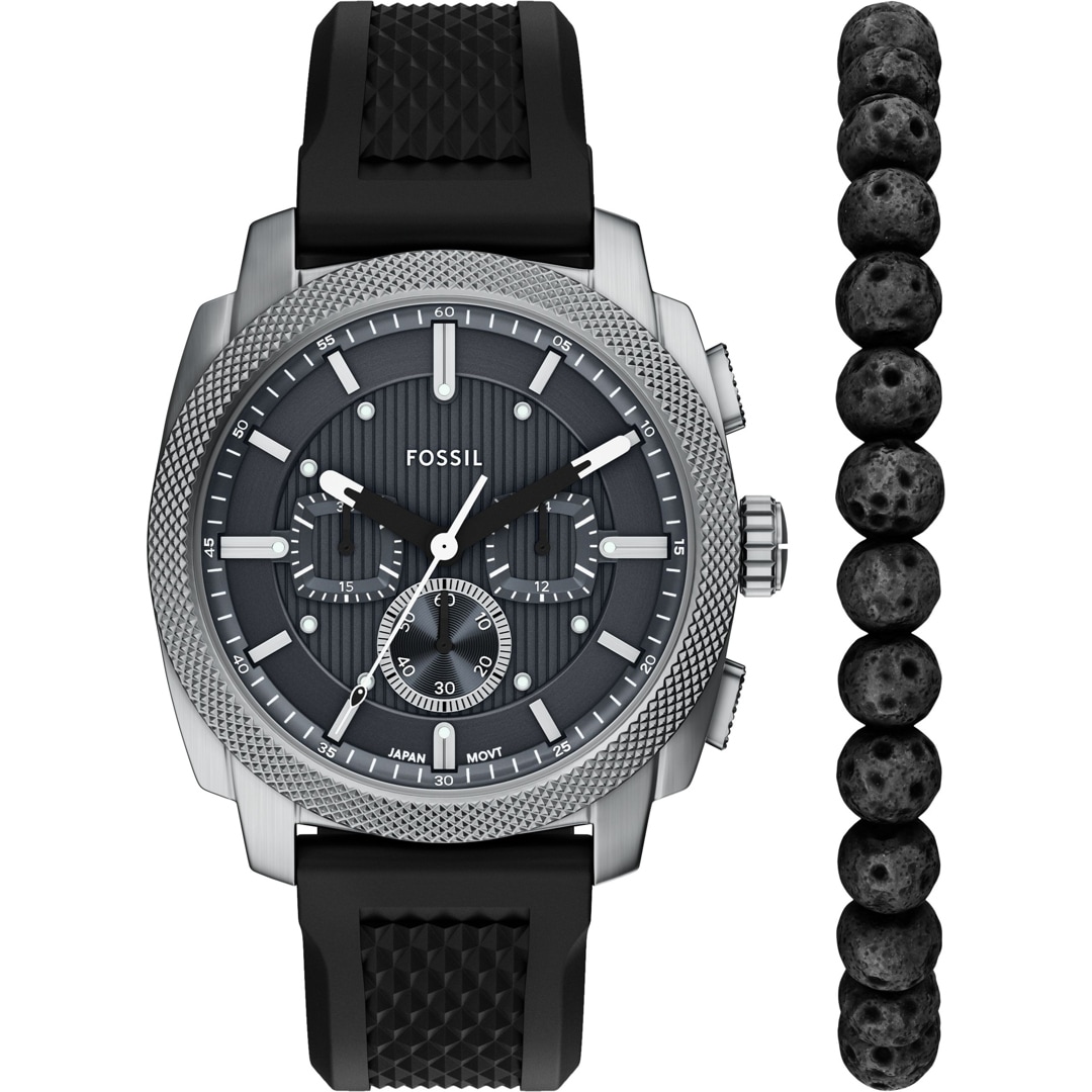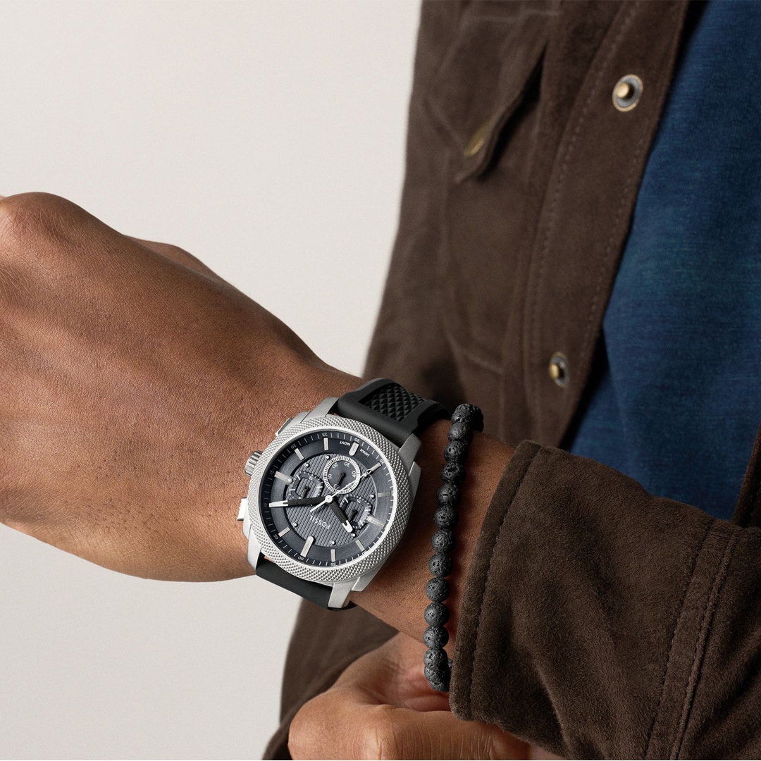 Diese Uhr Machine Chronograph zieht mit ihrer ausgefallenen gerändelten Lünette die Blicke auf sich. Das graue Zifferblatt weist eine Mischung aus satinierten, gebürsteten und strukturierten Finishs auf, die ihm Tiefe und Dimension verleihen. Die Hilfszifferblätter optimieren die Funktionalität und ergänzen das grosse, stromlinienförmige, runde Gehäuse. Ein präzises Quarzwerk mit Chronographenfunktion sowie ein robustes und praktisches schwarzes Silikonband runden den toughen Style ab. Diese Uhr ist zusammen mit einem schwarzen Lavastein-Perlenarmband das perfekte Geschenk.
