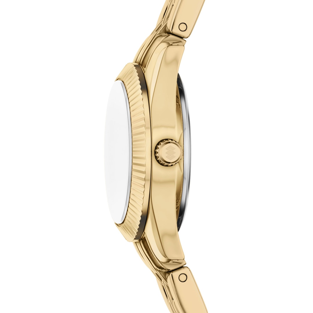 Ein goldfarbenes Sunray-Zifferblatt, passenden Zeigern und Indizes wird von einem runden, goldfarbenen Gehäuse umrahmt und sorgt für einen nahtlosen, monochromen Look. Ein poliertes und gebürstetes Edelstahlband in Goldfarbe sorgt für Struktur und schliesst mit einer Faltschliesse mit Doppel-Drücker für einen sicheren, komfortablen Sitz.