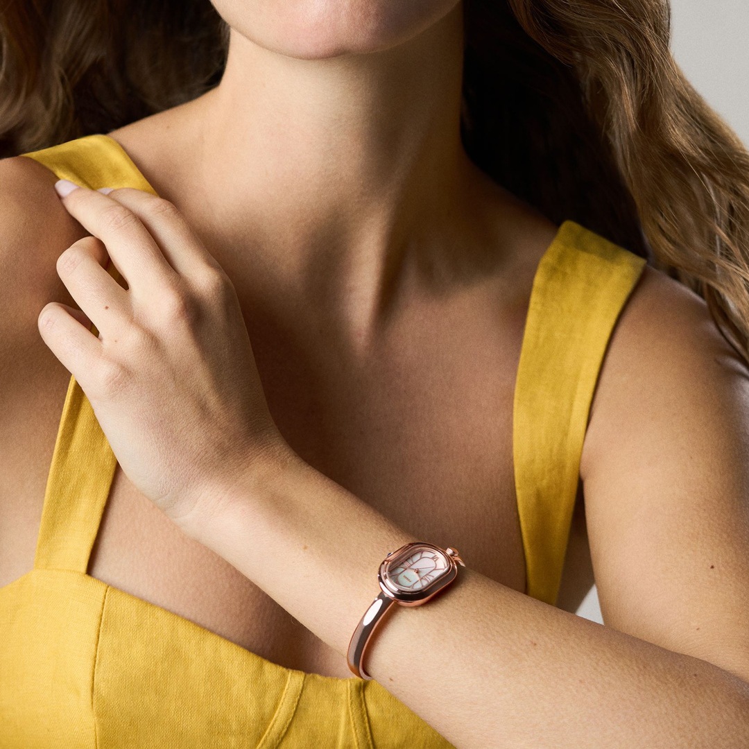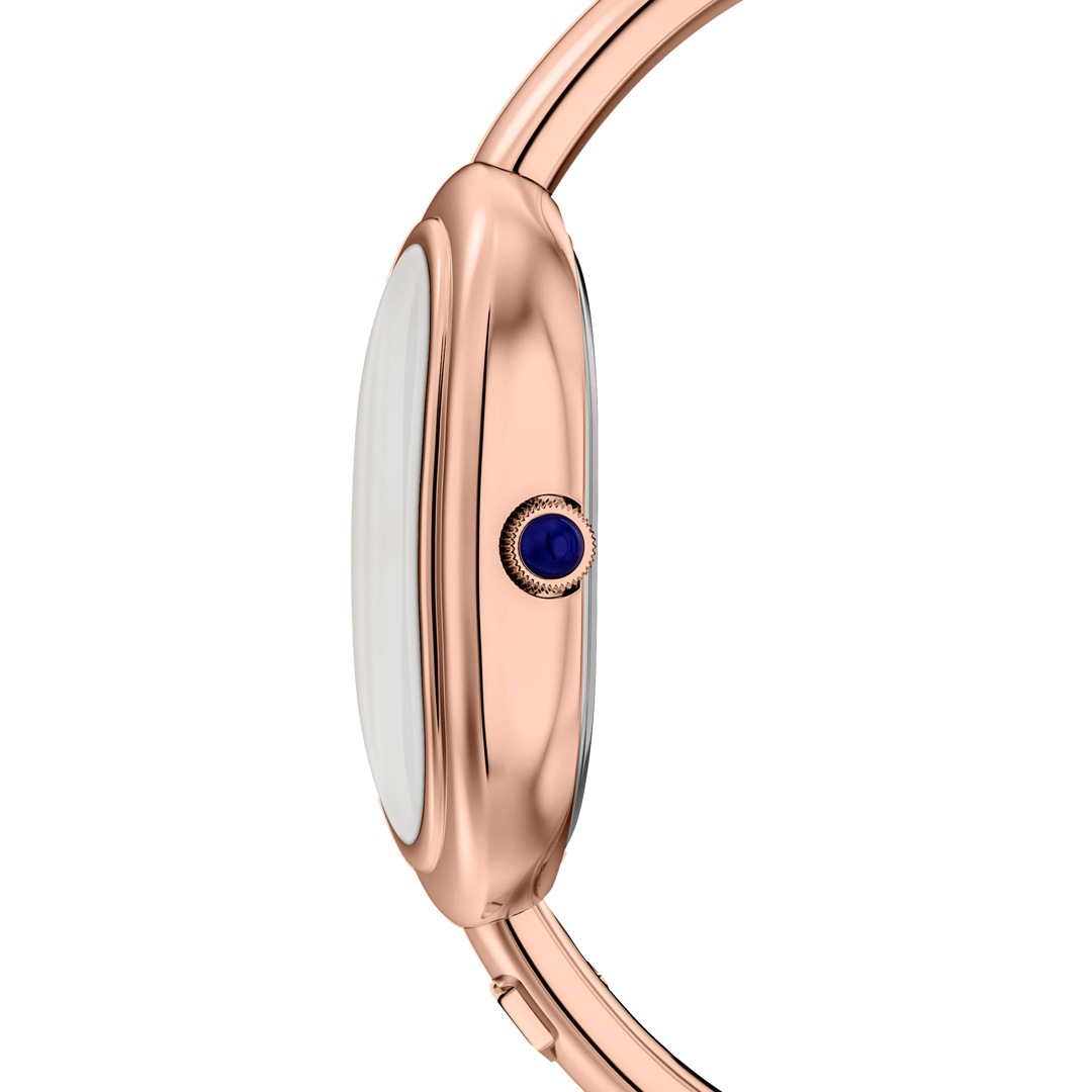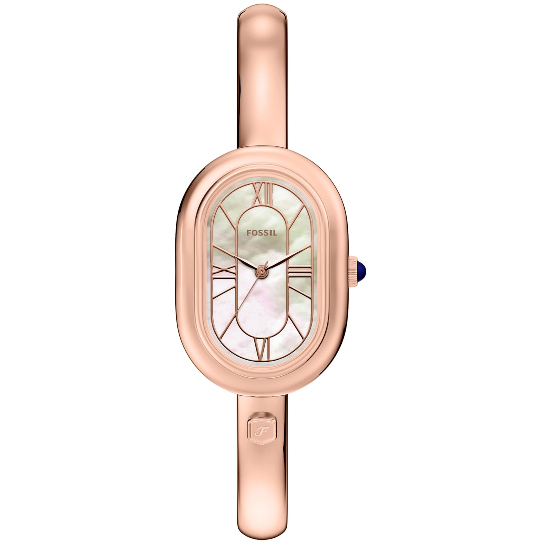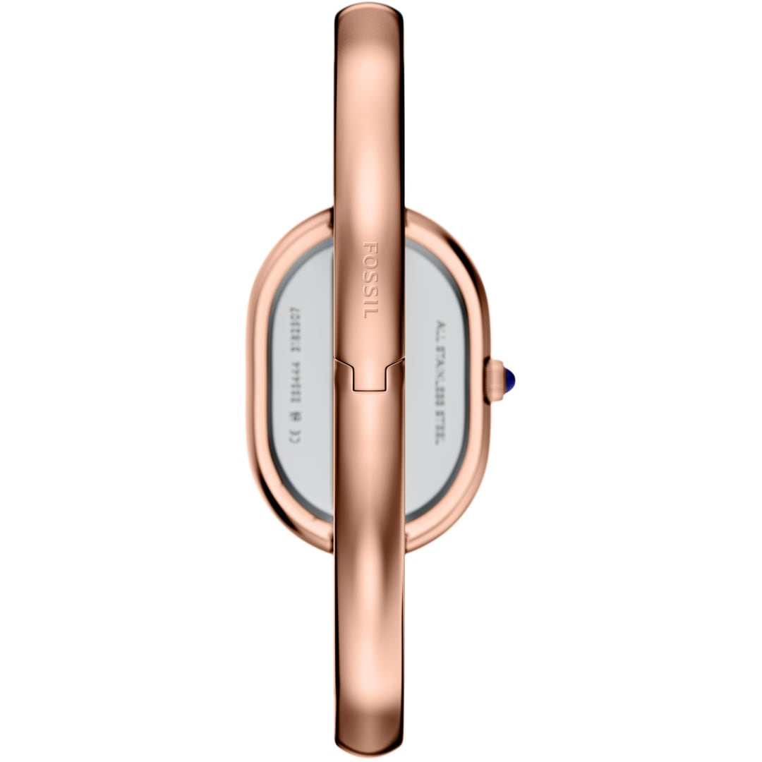 Das goldfarbene Edelstahlband, das von einem Schmuckstück inspiriert wurde, passt nahtlos zum ovalen Gehäuse, um eine elegante und raffinierte Armreifuhr zu schaffen. Das glänzende Zifferblatt mit den goldfarbenen Zeigern und Indizes unterstreicht die strahlende Eleganz und das stimmige Design der Uhr. Der Armreif verfügt über eine praktischen Faltschliesse mit Druckknöpfen mit eingraviertem Fossil Logo, das ein einfaches Tragen und Abnehmen ermöglicht.