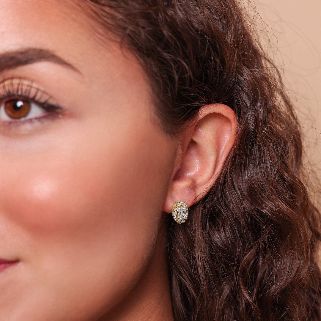 Découvrez l'élégance intemporelle de nos clous d'oreilles en or jaune précieux. Chaque clou est surmonté d'un élément décoratif ovale orné d'une fascinante composition de diamants étincelants. Trente-cinq brillants éclatants et trois pierres baguettes exquisément taillées s'associent ici à la perfection pour offrir un scintillement incomparable.