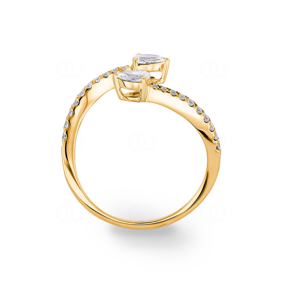 Découvrez un bijou qui séduit par sa forme exceptionnelle. Cette bague ouverte en or jaune 18 carats joue habilement avec l'asymétrie et la lumière. Au centre de l'attention, deux diamants taille poire se font face aux extrémités de l'anneau incurvé, conférant au bijou une allure à la fois dynamique et harmonieuse. Ce duo est accompagné de 20 fins brillants, sertis avec précision dans l'or, qui soulignent la ligne élégante du design. Cette bague est une déclaration de style qui allie haute qualité et design moderne – parfaite pour apporter une touche singulière à votre look, que ce soit au quotidien ou en tenue de soirée.
