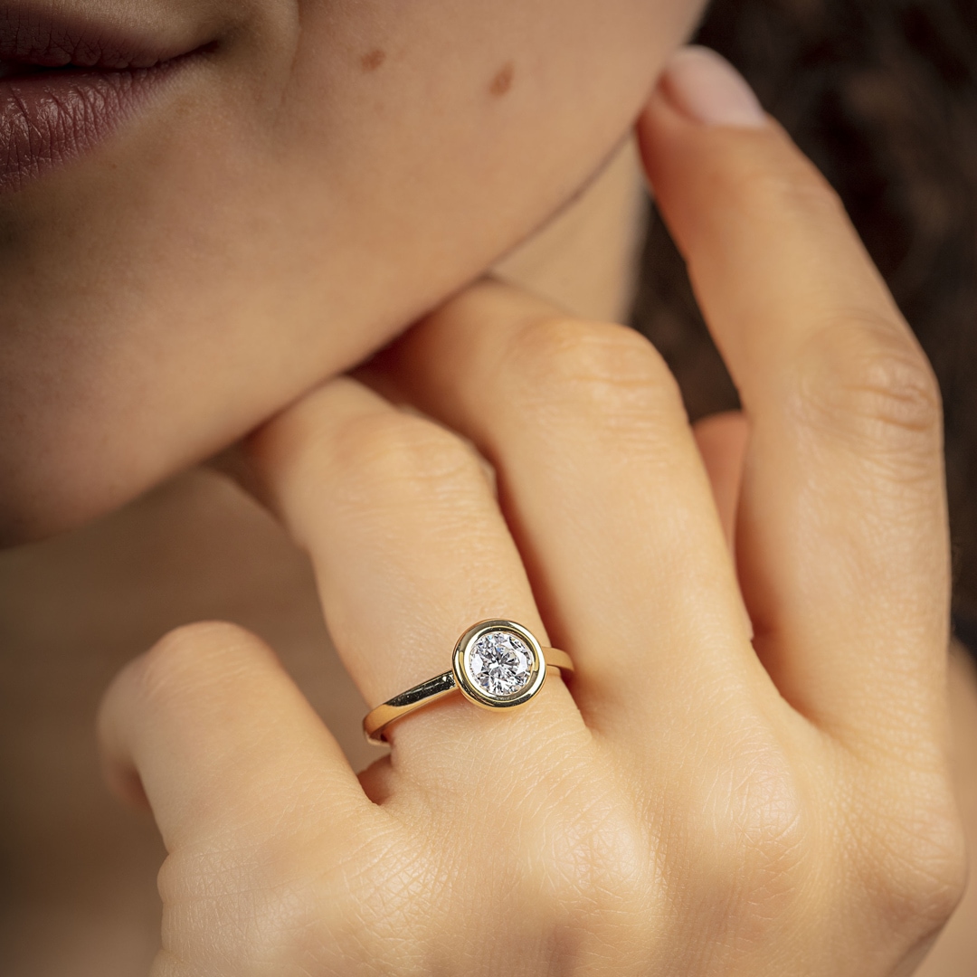 Le plus beau moment de sa vie doit commencer par une bague exceptionnelle. En or jaune 18 carats, cette bague de fiançailles est à la fois légère et délicate. Un diamant de 0,70 ct, serti clos, en constitue le couronnement scintillant. Le solitaire incarne l'essence pure de l'amour et brille dans une splendeur unique. Bien entendu, toutes les bagues avec diamant possèdent un certificat d'authenticité.