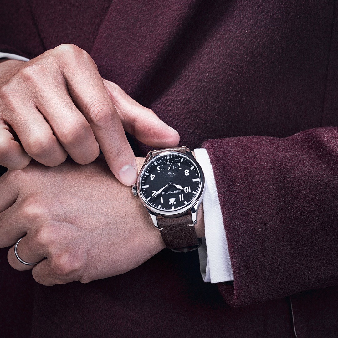 Pour le choix du bracelet en veau marron, Aerowatch s’est inspiré des bracelets cuirs historiques grâce auxquels les garde-temps pouvaient également être portés sur une épaisse combinaison de pilote.