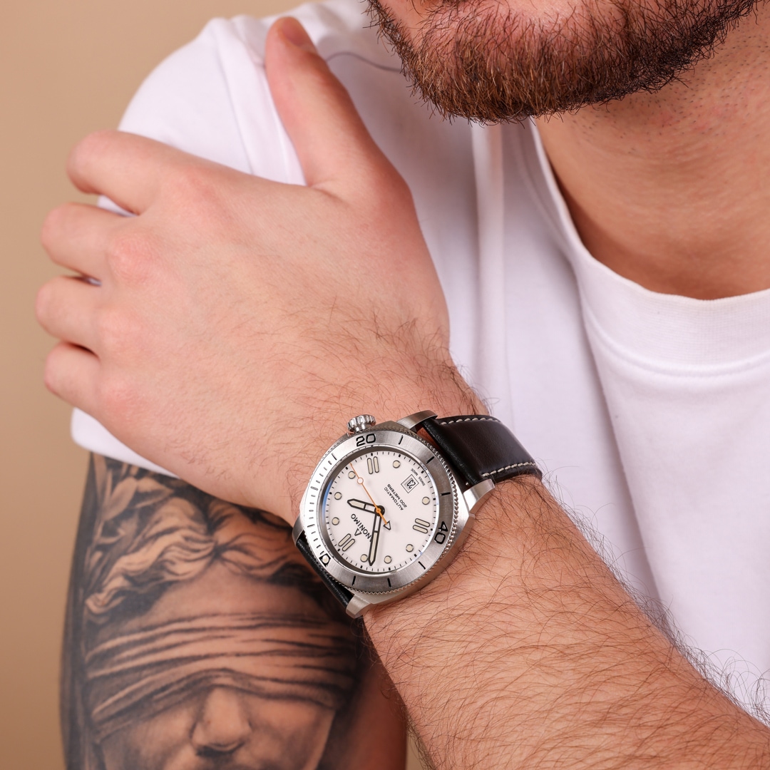 Le boîtier en acier inoxydable, robuste et en forme de coussin, d'un diamètre de 42 mm et d'une hauteur de 11,80 mm, reflète le caractère fort du NAUTILO. La lunette du plongeur et le dos du boîtier ouvert sont vissés ensemble, ce qui le rend étanche à 200 mètres. Ainsi, rien ne s'oppose aux aventures sur terre et dans l'eau. Les index et les détails gravés sur la lunette, positionnés en forme de triangle à 4, 8 et 12 heures, symbolisent le A d'ANONIMO. La montre est portée sur un bracelet en cuir noir avec une boucle à ardillon et une couture blanche. Par respect pour ses racines, ANONIMO a choisi de fabriquer les bracelets en cuir en Italie. Les maîtres selliers du Piémont utilisent des produits naturels et écologiques et des techniques traditionnelles pour assurer la durabilité et le confort.
