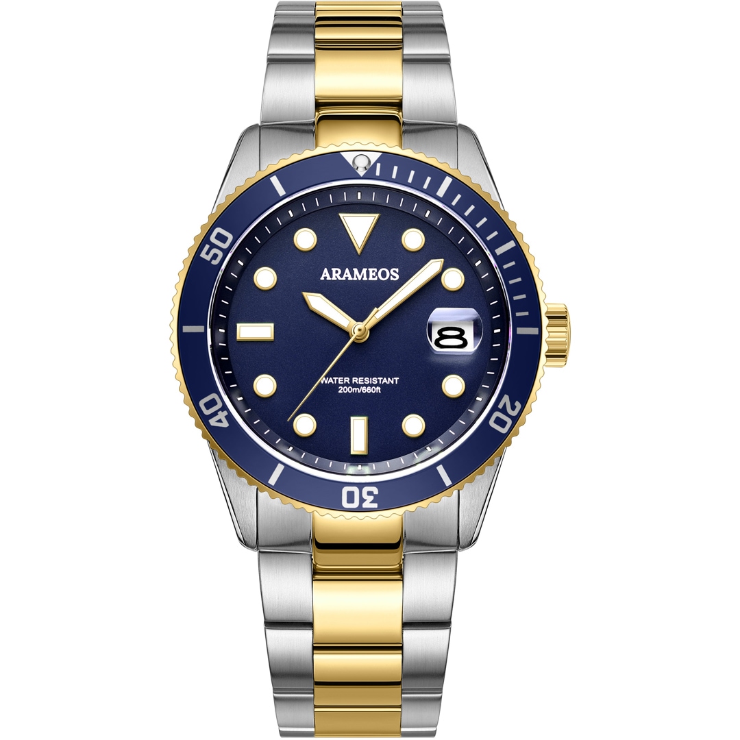 La clarté et les détails fonctionnels sont les maîtres-mots de cette Arameos Atlantis Diver. Le boîtier de 41 millimètres est composé d'acier inoxydable de haute qualité et présente un équilibre subtil entre surfaces brossées mates et polies brillantes. La lunette tournante unidirectionnelle en aluminium bleu est accentuée par un placage or IP sur son pourtour, créant une apparence très harmonieuse en combinaison avec le cadran bleu mat.