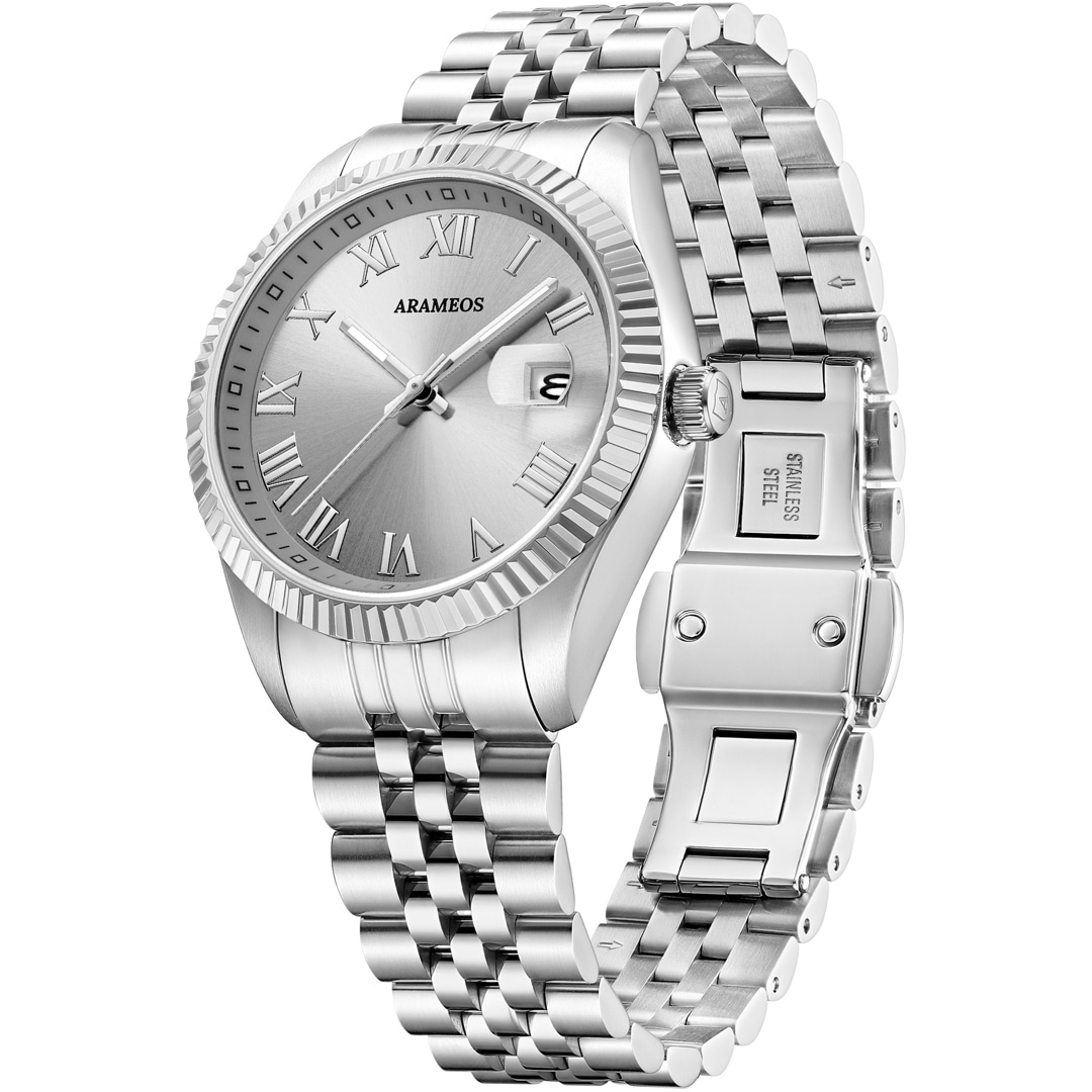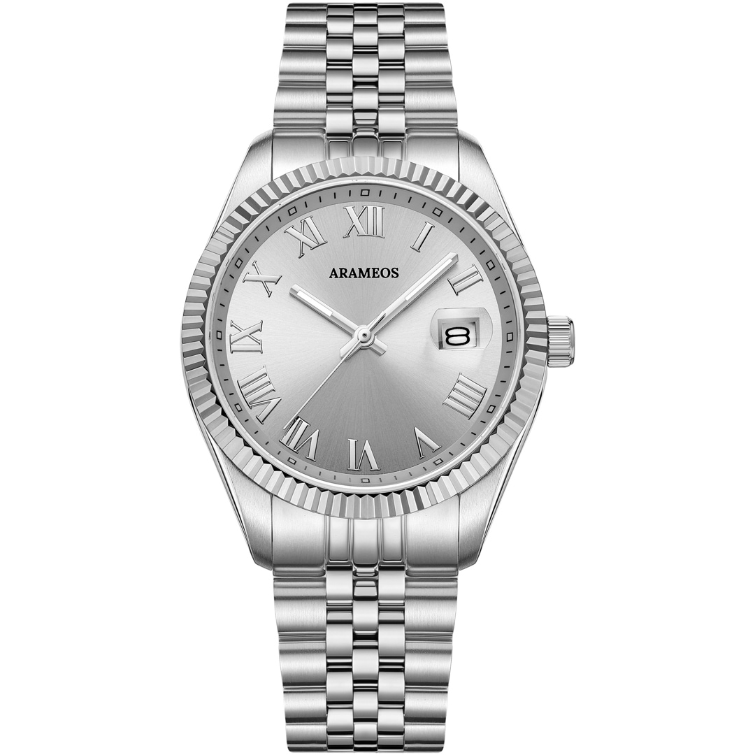 L'Arameos Prestige Elegance est un hommage à l'horlogerie classique, parfaitement dimensionnée pour le poignet féminin. Avec son boîtier de 36 mm en acier inoxydable de haute qualité, elle allie présence et légèreté gracieuse. L'élément de design le plus marquant est la lunette cannelée avec précision, qui capture discrètement la lumière à chaque mouvement et dirige le regard vers le cadran argenté.