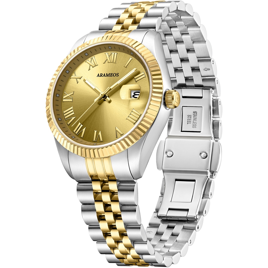 L'Arameos Prestige Elegance incarne un équilibre réussi entre l'art horloger classique et le luxe moderne. Le boîtier en acier inoxydable de 36 mm gagne une profondeur et une brillance particulières grâce à la lunette cannelée avec précision et son placage or IP de haute qualité. Ce thème doré se poursuit avec cohérence au centre de la montre : le cadran doré capture la lumière grâce à une fine finition soleillée et fait rayonner les chiffres romains classiques avec une noble clarté.