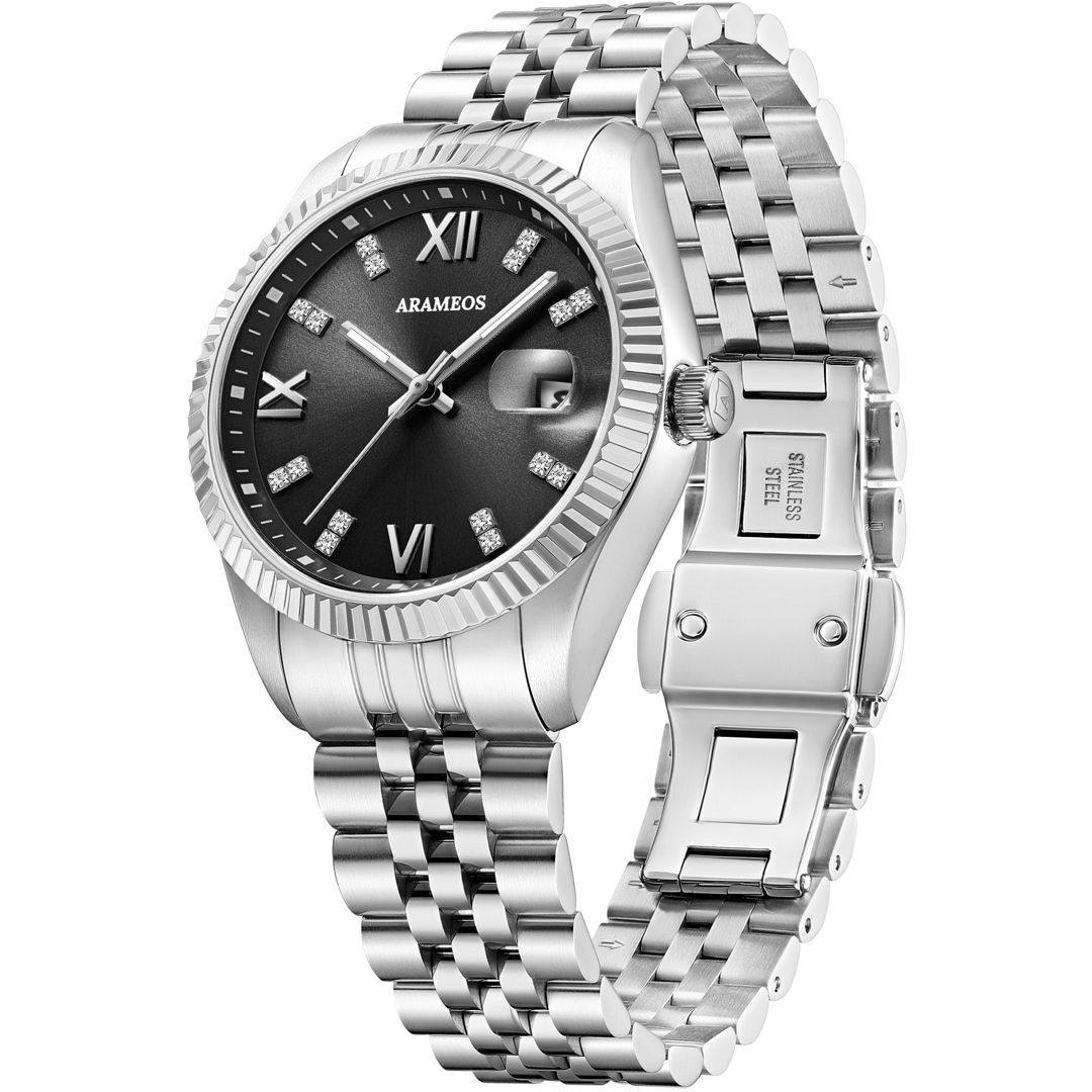 Avec l'Arameos Prestige Elegance, vous optez pour un garde-temps qui allie magistralement force et finesse féminine. Le cadran noir profond, avec sa finition soleillée discrète, constitue la scène parfaite pour un détail particulier : l'association de chiffres romains classiques et d'index en zirconium étincelants. Ces derniers créent de fins points lumineux à chaque incidence de la lumière, sans pour autant dominer la ligne claire de la montre.