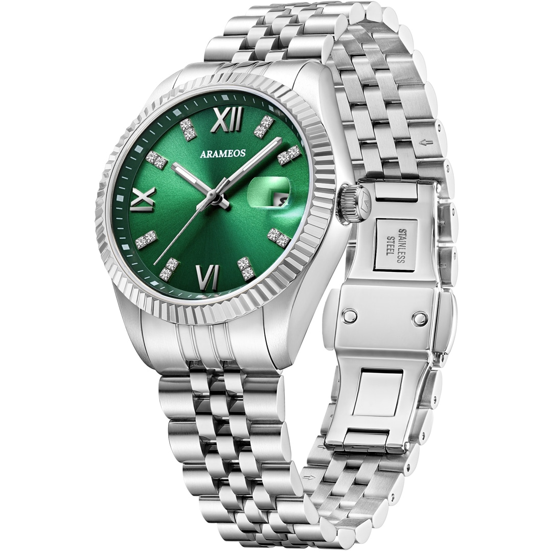 L'Arameos Prestige Elegance est un garde-temps qui séduit par son alliance harmonieuse de la couleur et de la lumière. Le cadran vert marquant acquiert une profondeur fascinante grâce à la finition soleillée précise, variant selon l'incidence de la lumière. La composition des index constitue un point fort particulier : les chiffres romains classiques rencontrent des pierres de zirconium au scintillement discret, conférant à la montre une fine brillance féminine sans jamais être envahissante.