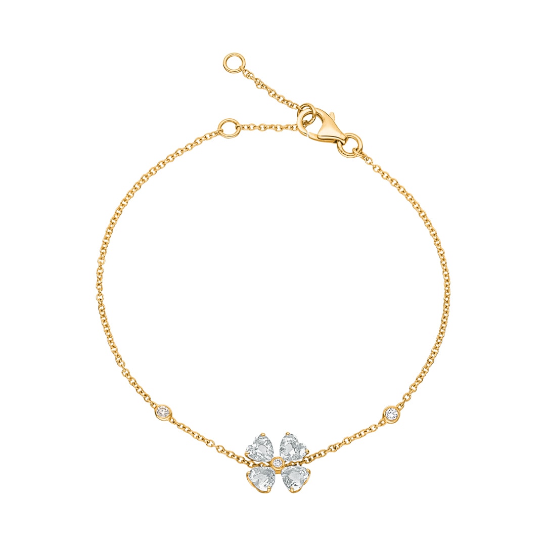 Découvrez la beauté naturelle de la nature avec ce fascinant bracelet en or jaune 18 carats. Le pendentif incorporé est réalisé avec quatre améthystes vertes taillées en forme de cœur et confère une touche de fraîcheur à votre tenue. La disposition des pierres évoque une charmante fleur qui orne votre poignet. Un brillant étincelant serti clos est placé au centre de la composition et capte la lumière d'une manière époustouflante. Deux autres diamants sont intégrés dans le bracelet et complètent le design. Ce bracelet est le cadeau idéal pour un être cher ou un magnifique bijou pour vous-même.