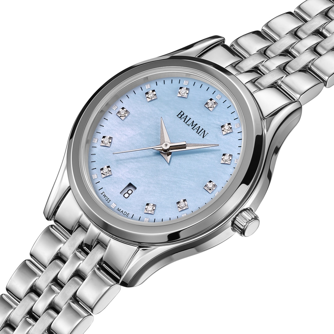 Les montres Balmain, estampillées du prestigieux label Swiss Made, sont fabriquées à Saint-Imier, berceau de l’horlogerie traditionnelle logé au cœur du Jura. Des garde-temps accessibles en acier inoxydable, des collections prestigieuses en or ou sertis de somptueux diamants, les montres Balmain répondent toujours à de hautes exigences de qualité. Chaque détail est parfaitement réalisé, s'adaptant au tapis rouge ou au trottoir de la ville et complétant le style de vie dynamique des hommes et des femmes d'aujourd'hui. Les montres Balmain s’attachent à perpétuer cette tradition d’un temps où le sur-mesure régnait en maître. Le savoir-faire des horlogers suisses et l'innovation ont permis la réalisation de collections abouties qui reflètent fidèlement la sophistication et l'attrait de la haute couture. Des formes audacieuses et attrayantes sont une signature propre à la manufacture. La décoration avec des arabesques est aussi une caractéristique dominante dans la conception des montres Balmain. L'histoire de la marque horlogère comprend un certain nombre de premières et de créations sensationnelles. Dans les années 1990, Balmain a fait un usage sans précédent des sertissages de diamants sur les boîtiers de montre en acier. En 1998, le Chronolady a été présenté comme le plus petit chronographe pour dame au monde.