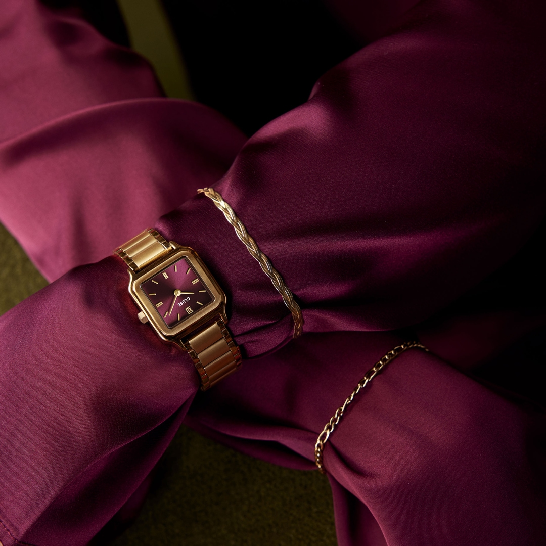 Ajoutez une touche de luxe et de sophistication à votre look grâce à la montre Gracieuse Petite pour femme. Elle est dotée d’un boîtier carré de 24 mm, de couleur or, d’un riche cadran cerise foncé et d’un bracelet en acier inoxydable de 14 mm à 3 maillons. Personnalisez facilement le look de votre montre avec n’importe quel bracelet de montre de 14 mm. Vous pouvez facilement ajuster vous-même la taille du bracelet de montre.
