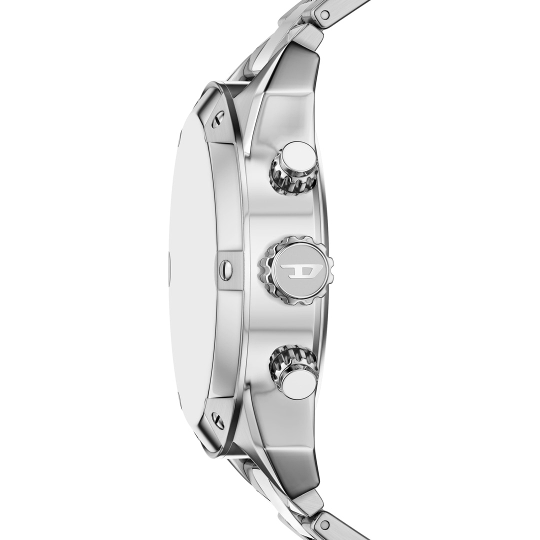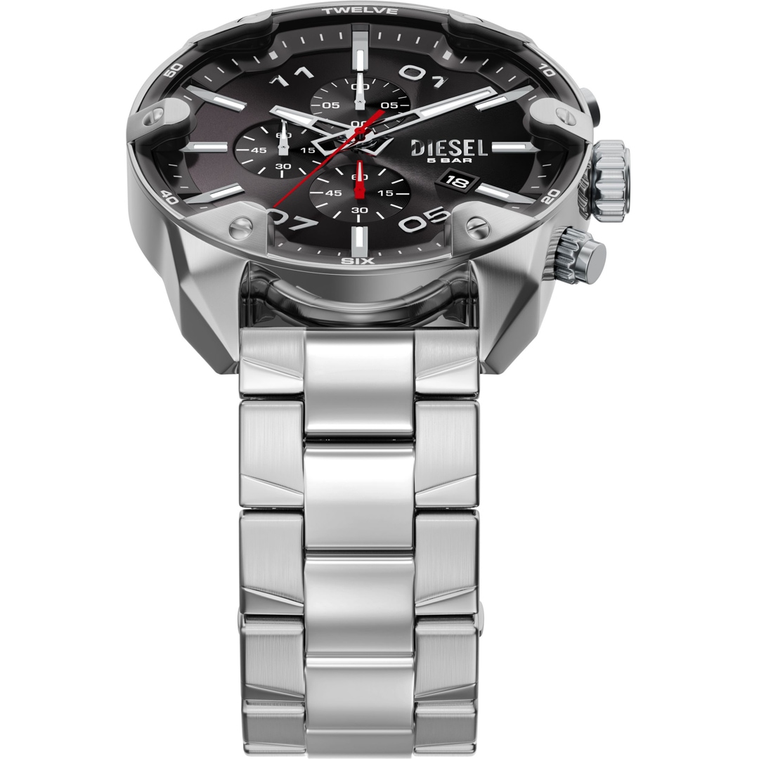 Montre-bracelet Diesel Spiked 49 mm. Avec cadran noir soleil, mouvement chronographe et bracelet argenté en acier inoxydable avec incrustation de chaîne.
