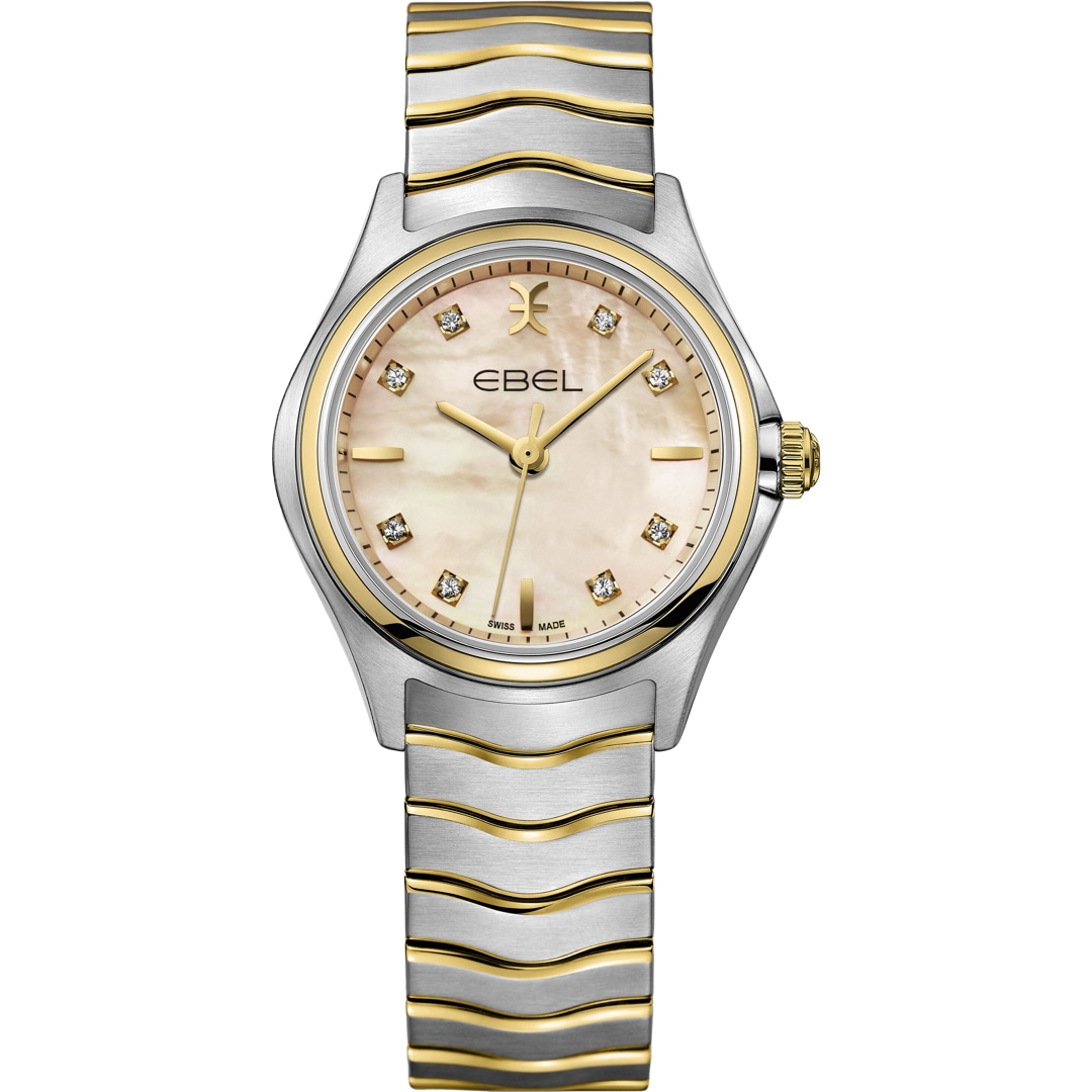 Un scintillement de luxe pur : cette montre dame EBEL Wave célèbre l'élégance féminine. La pièce maîtresse est le cadran en nacre véritable d'un doux ton abricot, qui révèle un jeu de lumière unique à chaque mouvement. Huit diamants éclatants et des index appliqués marquent les heures. Le boîtier de 30 mm en acier inoxydable est luxueusement accentué par la lunette et la couronne en or jaune 18 carats. Cette harmonie bicolore se poursuit sur le légendaire bracelet à maillons « vague », qui épouse le poignet avec un confort inimitable. Un mouvement à quartz suisse précis et un verre saphir traité antireflet parachèvent cette incarnation de la grâce fluide.