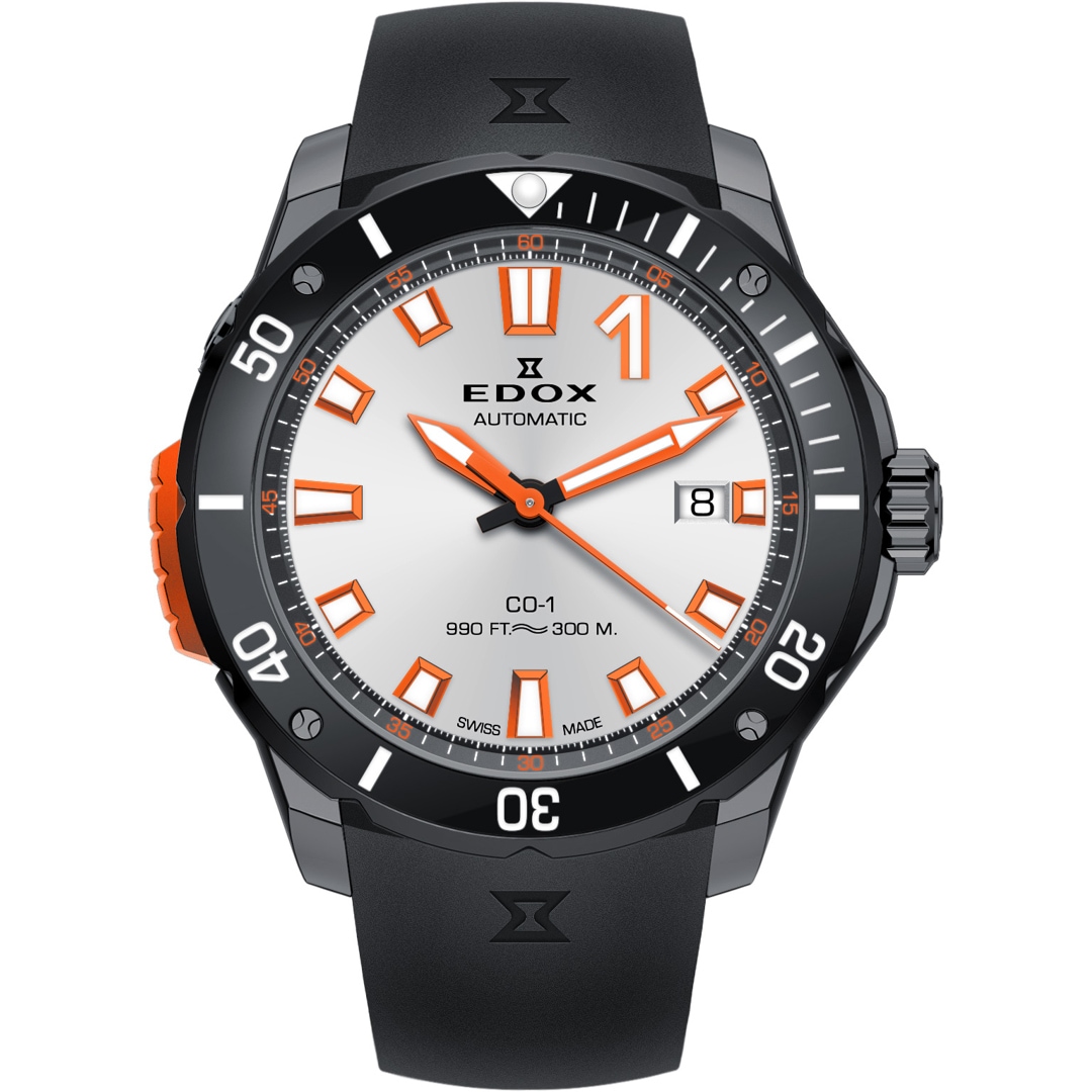 Le design suit strictement la fonction : sur le cadran argenté épuré, les index et aiguilles en orange signal lumineux assurent une lisibilité parfaite – même dans les conditions de luminosité les plus difficiles sous l'eau. En son cœur bat le robuste calibre automatique Edox 80A (base SW200), qui vous accompagne avec une réserve de marche de 38 heures et la précision suisse.