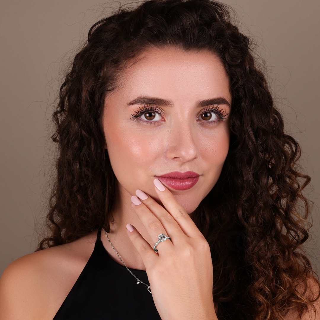 La bague en halo est entourée de 32 brillants étincelants qui ornent à la fois la pierre centrale et le bandeau, pour un poids total de 0,34 carat. Ces brillants créent une aura rayonnante qui complète parfaitement le reflet de la lumière du diamant central.