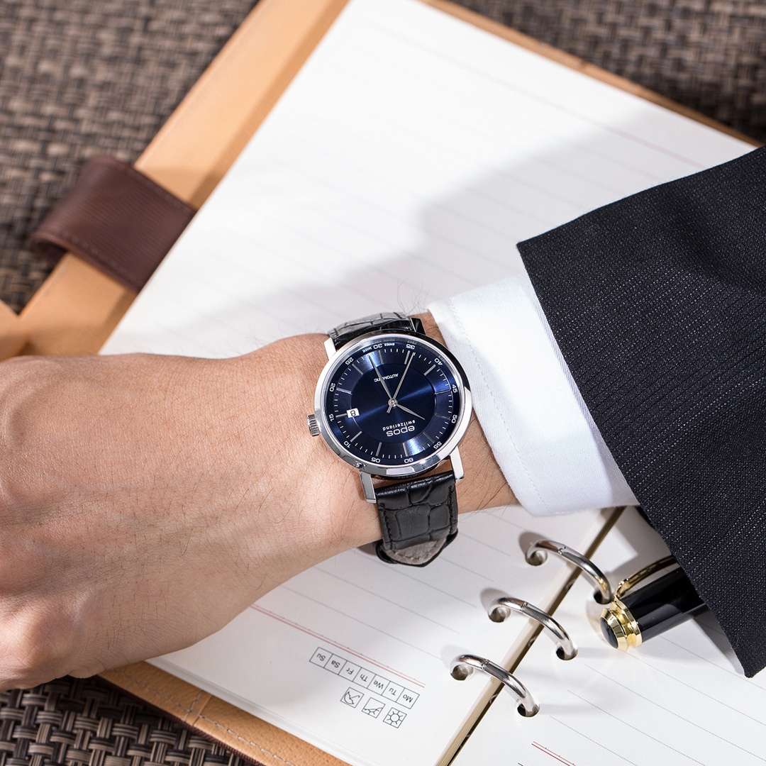 L’Epos Timeless 3387 Automatic allie élégance classique et savoir-faire horloger suisse. Son boîtier en acier inoxydable entièrement poli, doté d’un verre saphir inrayable et d’un fond transparent, met en valeur le mouvement Sellita SW300 de haute facture, entièrement décoré. Le perlage délicat sur le mouvement et le rotor révèle le souci du détail et la précision de l’horlogerie. Cette montre automatique élégante offre un style intemporel et raffiné, parfait pour les amateurs de mécanique suisse et de design épuré.