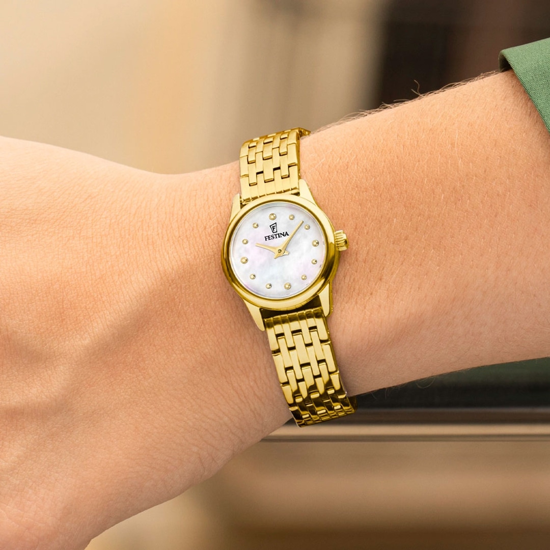 Des accents scintillants et un design particulièrement délicat caractérisent cette montre de la collection Festina Mademoiselle. Avec son boîtier très fin de 23 mm en acier inoxydable, elle est un véritable bijou au poignet. Le cadran est rehaussé d'index scintillants qui captent discrètement la lumière à chaque mouvement et apportent une touche de glamour. L'élégant bracelet à maillons complète parfaitement le look féminin. La montre est protégée par un verre minéral fiable – un charmant garde-temps pour tous les jours.