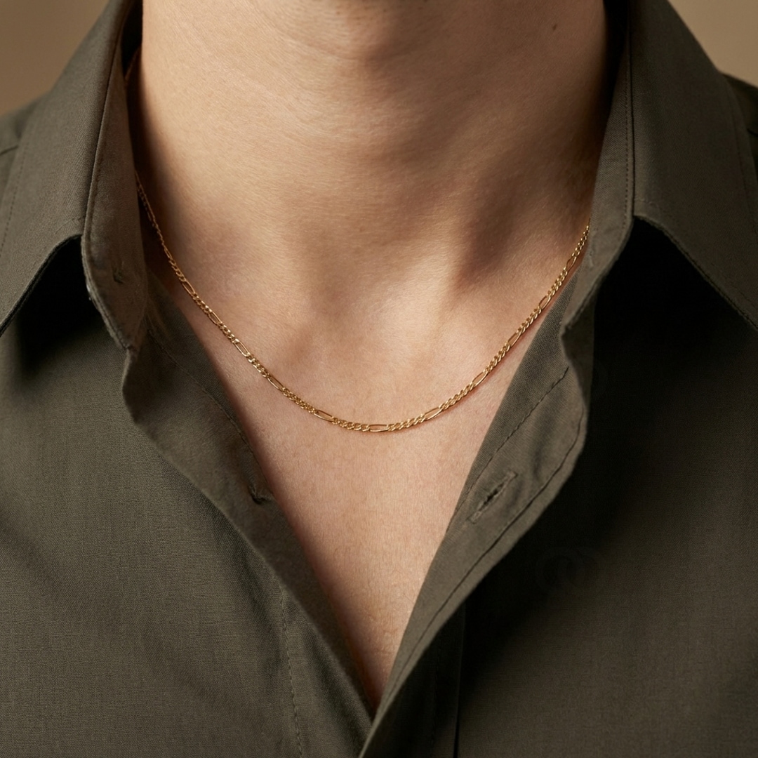 La chaîne Figaro est un type de chaîne qui ressemble essentiellement à une chaîne gourmette, car les deux chaînes ont la même structure. La particularité de la chaîne Figaro, et ce qui la distingue des chaînes gourmettes traditionnelles, est d'une part la présence de maillons de formes différentes et d’autre part leur disposition. Sur cette chaîne Figaro, trois maillons ronds sont toujours suivis d'un maillon ovale allongé, puis de trois maillons ronds. Les maillons ovales et longs confèrent à la chaîne Figaro un aspect particulièrement filigrane et noble. Cette fine chaîne en or jaune 18 carats est discrète et se combine de multiples façons. Il peut être porté aussi bien avec une tenue décontractée qu'avec une tenue de soirée élégante.