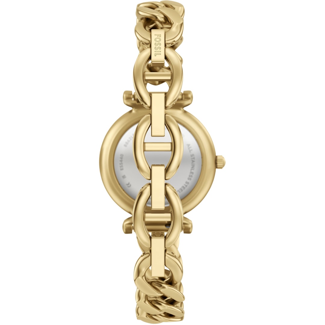 Un bracelet en acier inoxydable doré complète le boîtier rond et doré pour un look cohérent et poli. Le cadran noir brillant donne de la profondeur à la montre avec sa finition riche et lisse, tandis que les aiguilles fines assurent une fonctionnalité discrète. Le bracelet à chaîne blindée a été conçu pour être porté sans effort et dispose d'un fermoir 'Adjust-O-Matic' pour un ajustement personnalisé.