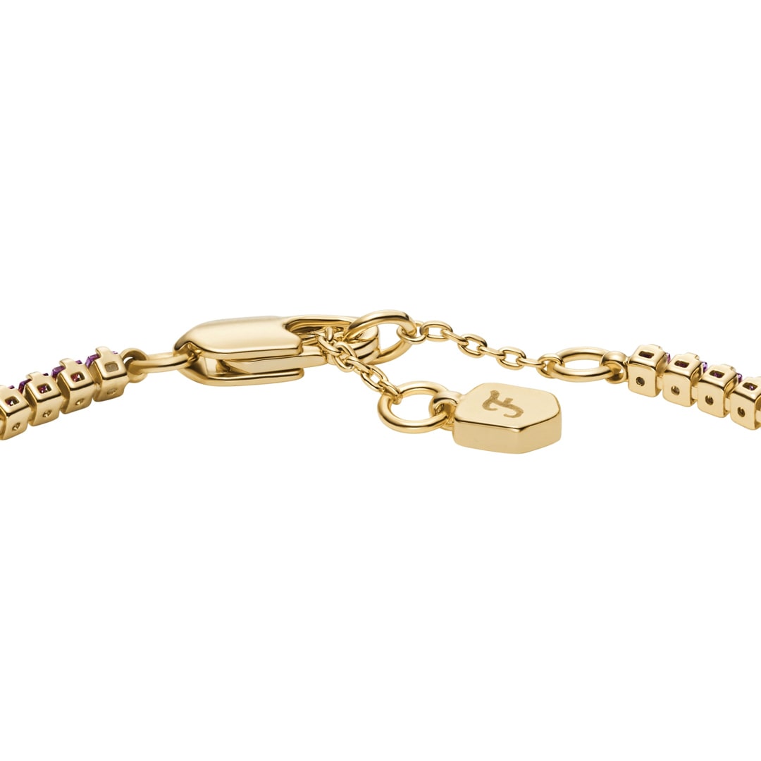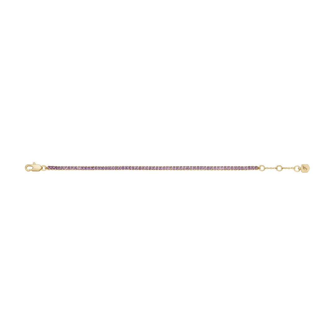 Ce bracelet à maillons tennis en laiton doré est doté d'un fermoir mousqueton.