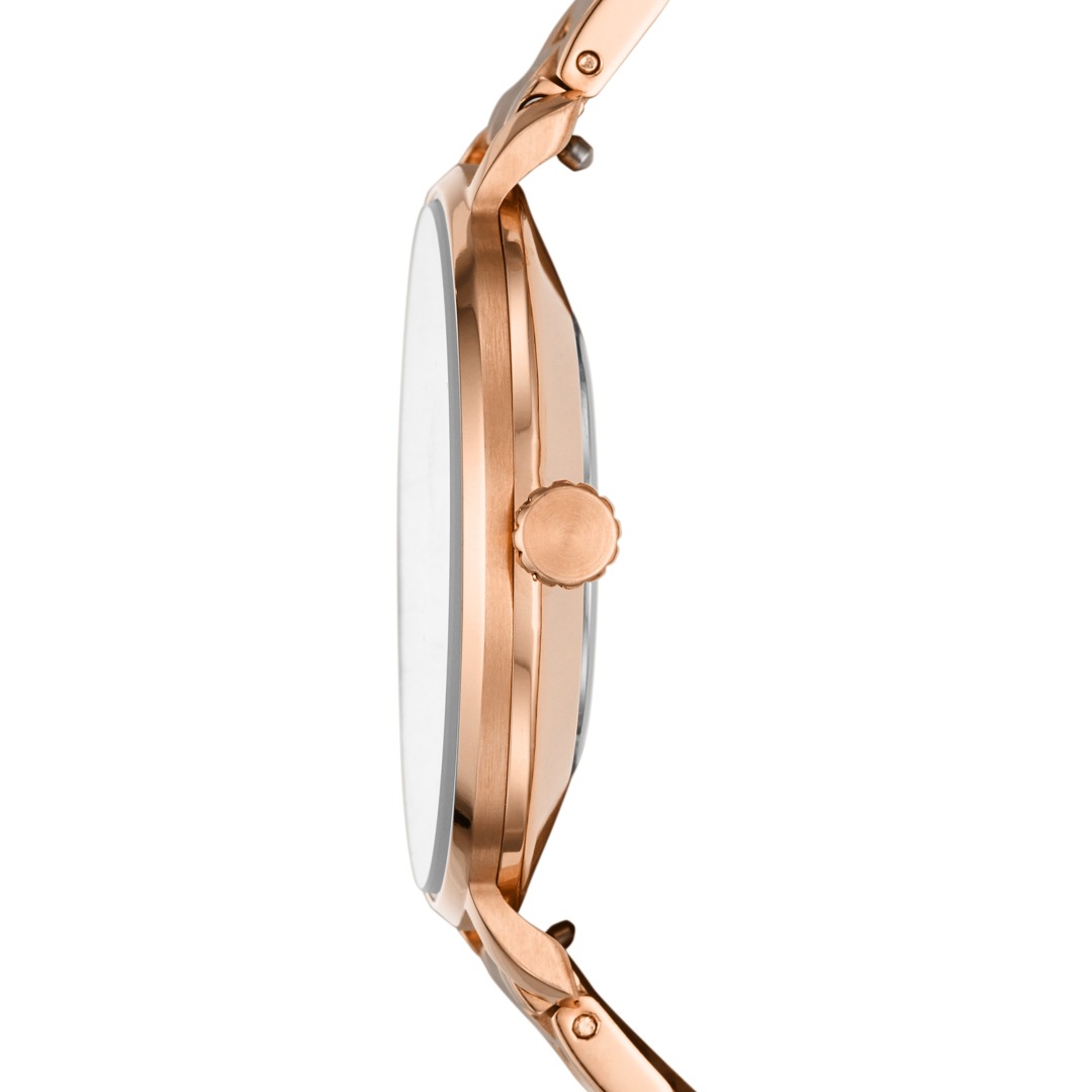 Cette montre pour dame Kalya avec boîtier de 36 mm est dotée d'un mouvement à 3 aiguilles, d'un cadran Sunray en or rose avec index à barres et d'un bracelet assorti en acier inoxydable.