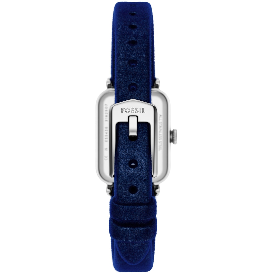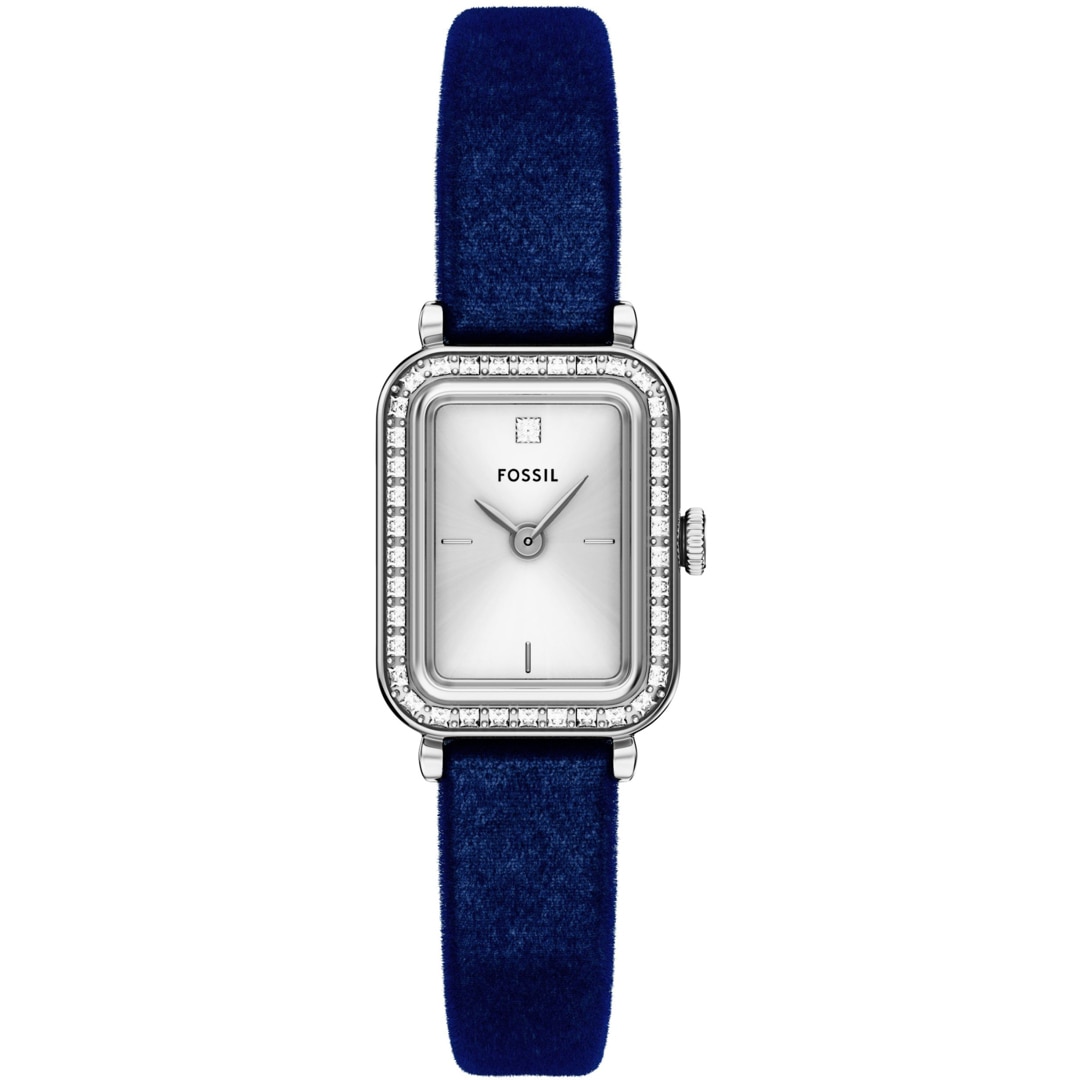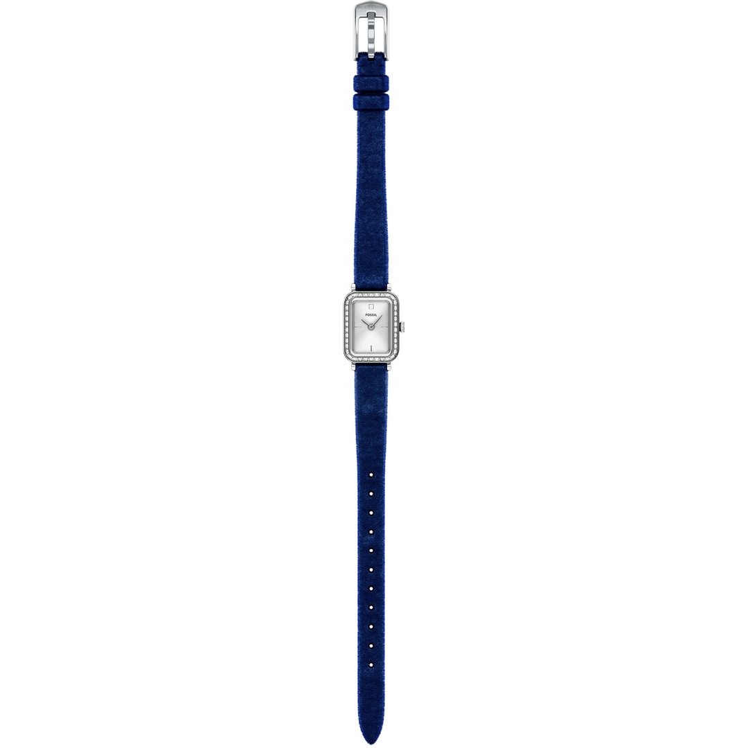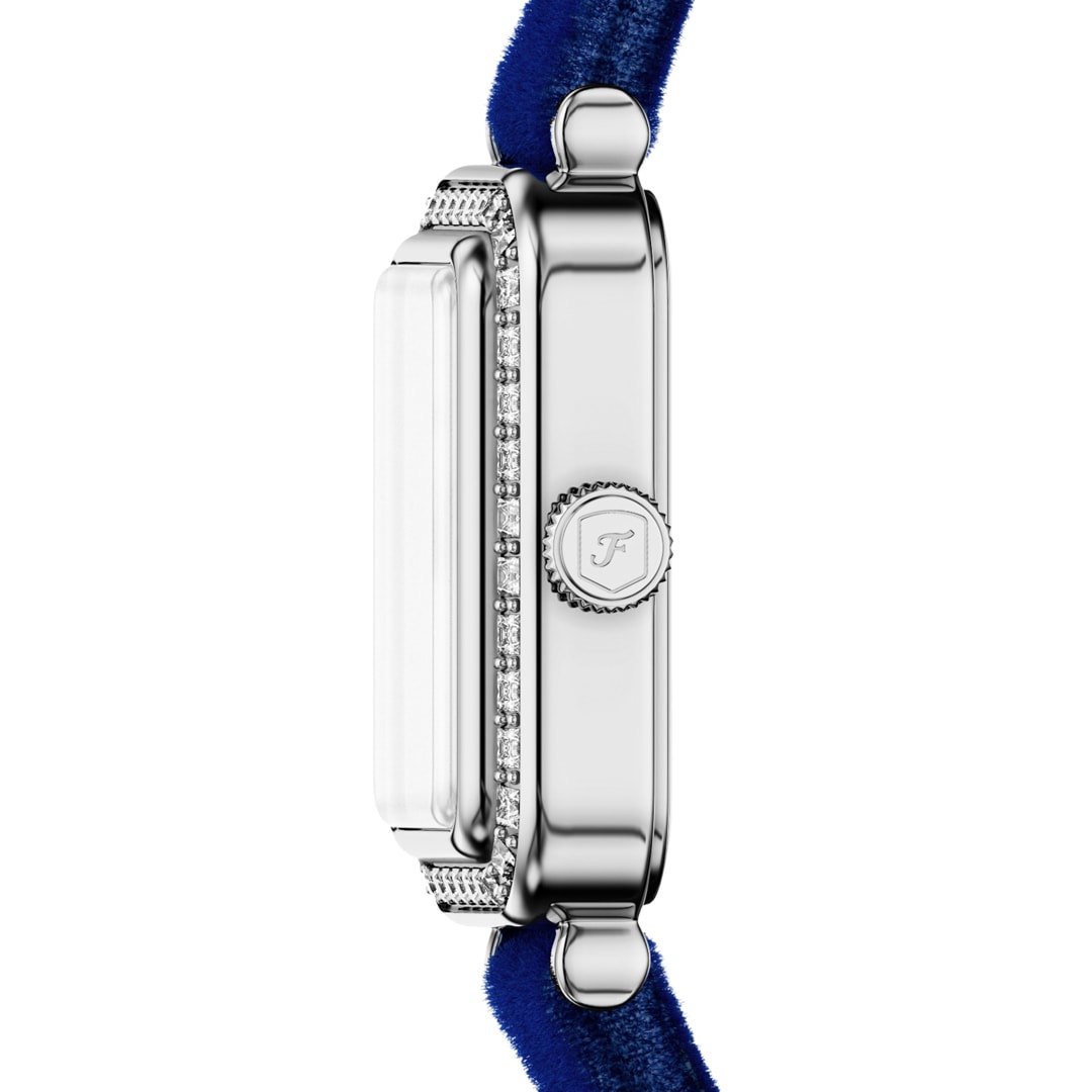 Un boîtier rectangulaire argenté et un bracelet en velours bleu marine lui confèrent un look sobre et discret. Le cadran argenté Sunray crée un contraste subtil et un mouvement à 2 aiguilles assure un chronométrage aérodynamique.
