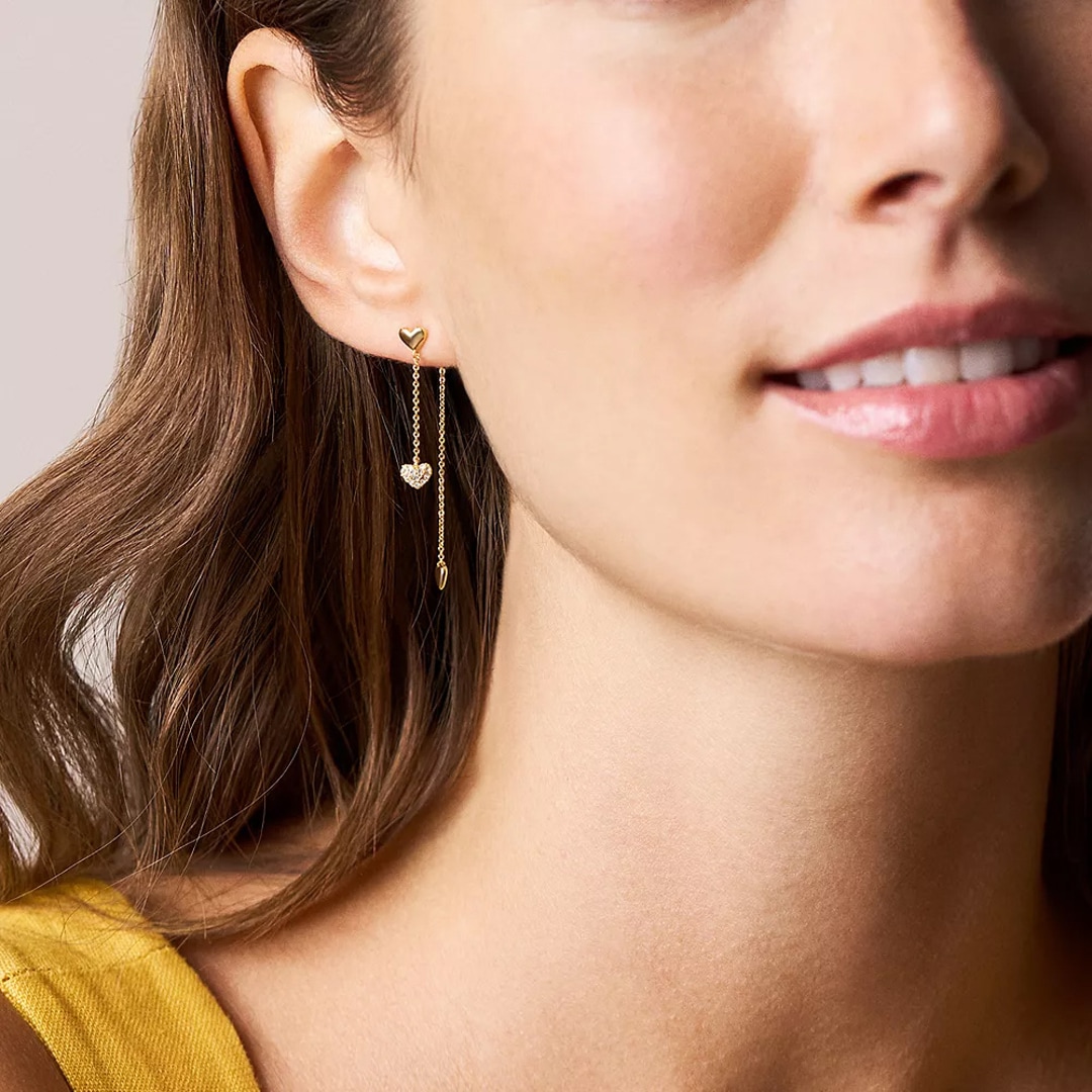 Des éléments en métal en forme de cœur et de délicats accents pavés de pierres de verre se répètent le long de la chaîne en métal doré. Ces boucles d'oreilles qui s'étendent de l'avant vers l'arrière créent une impression de mouvement, tandis que le fermoir poussette assure un maintien sûr. Ce modèle soigneusement fabriqué allie des détails délicats à une silhouette moderne et polyvalente.